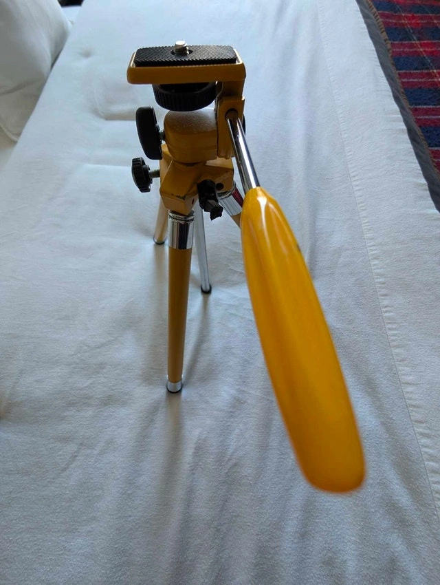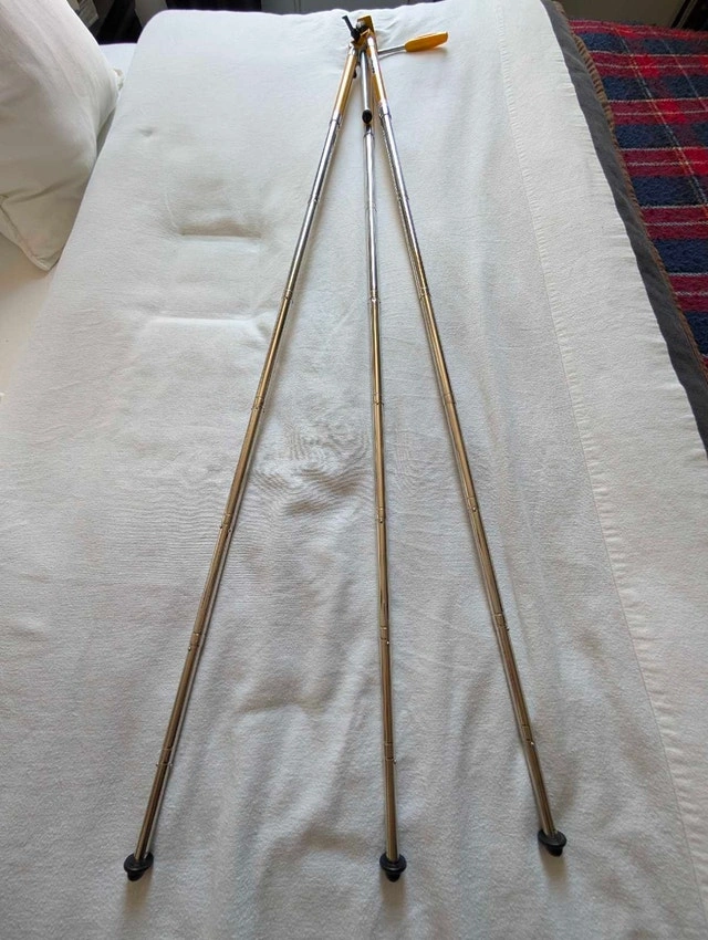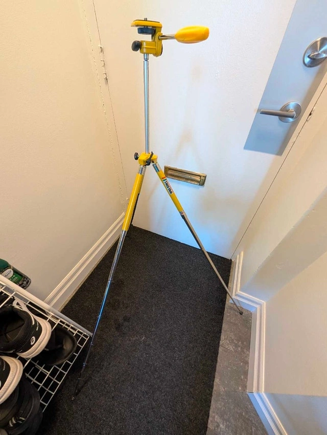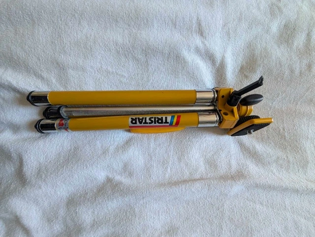 Selling a unique, vintage TriStar tripod in a distinctive mustard yellow finish with chrome accents. It's fully functional for photography, but its retro industrial look also makes it a great display piece for a studio, shelf decor, or a prop. This is a sturdy, high-quality metal tripod, not plastic. It works perfectly for holding a camera or a vintage camcorder, or just looks good folded on a bookshelf. Key Features: 8 adjustable height settings, extends to a maximum of 46 inches, and compacts down to 18 inches. Features a full 360-degree swivel (horizontal and vertical) with a sturdy handle. Durable metal construction with rubber feet and a standard thread mount (fits most DSLRs, mirrorless cameras, and projectors). In great vintage condition – the paint pops, legs extend/lock smoothly, and the head swivels freely. Pickup is in Downtown Toronto at Homewood Avenue & Wellesley.