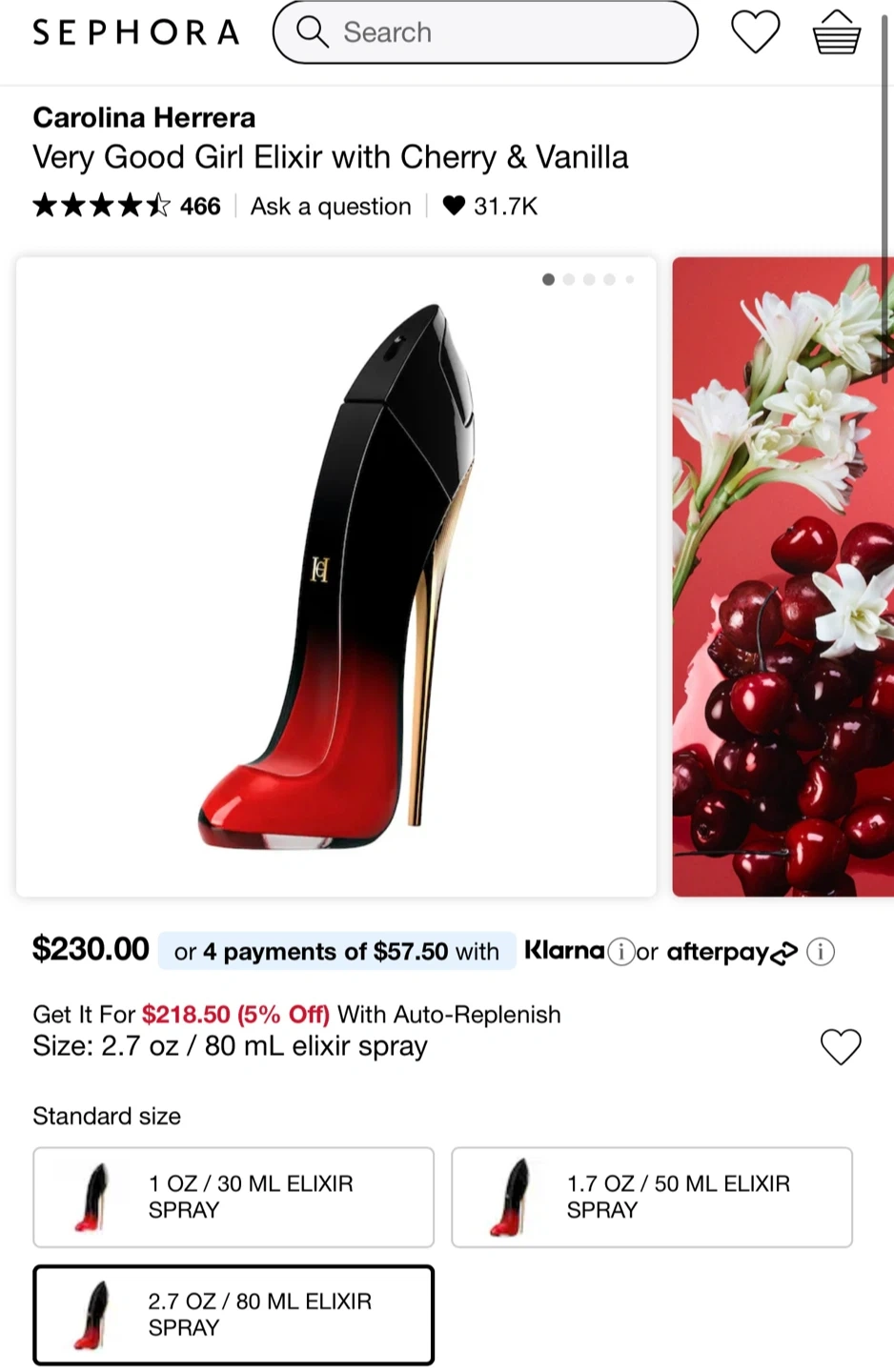 This is a Carolina Herrera Good Girl Very Elixir natural spray. It's an eau de parfum in a generous 80ml (2.7 fl oz) size. This perfume comes in its original packaging.