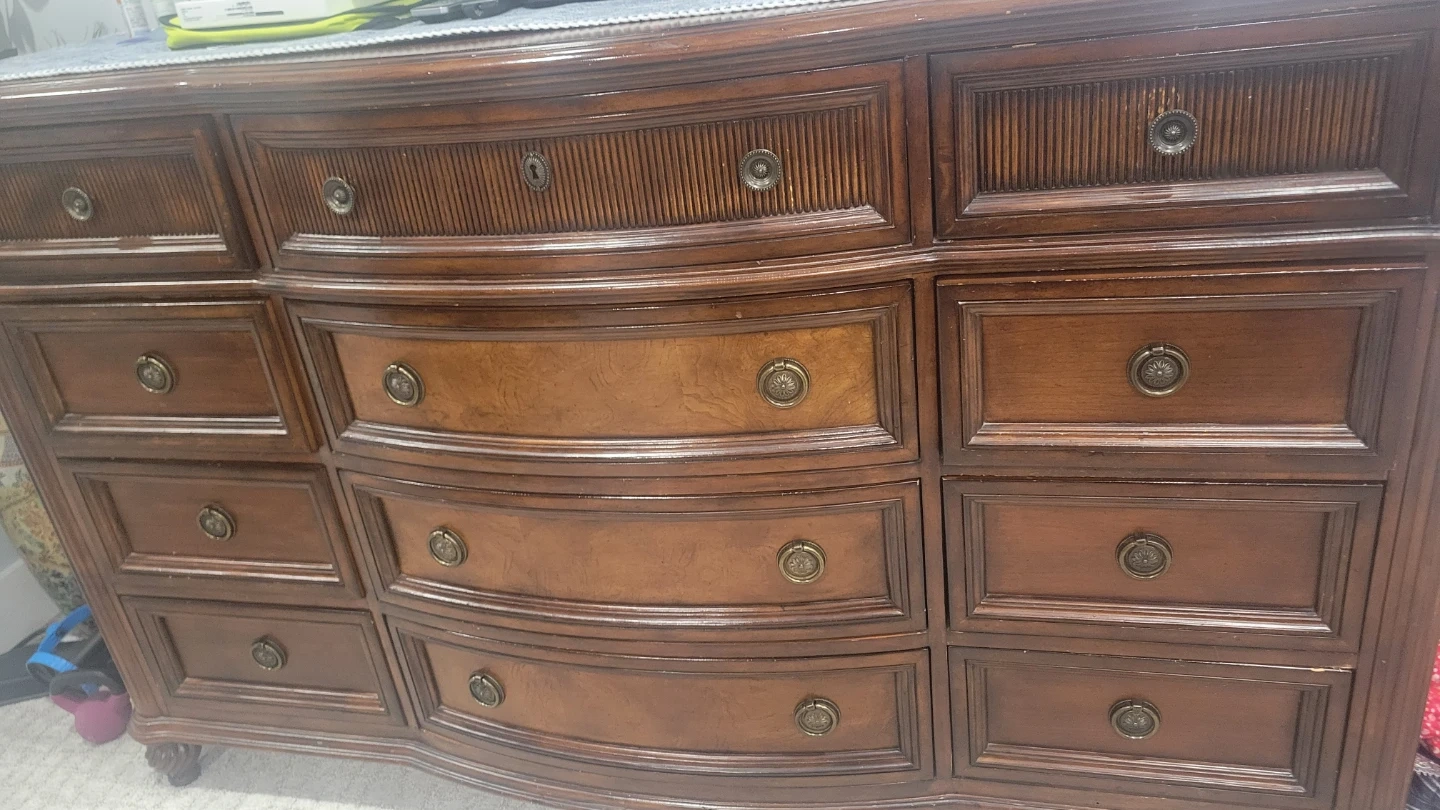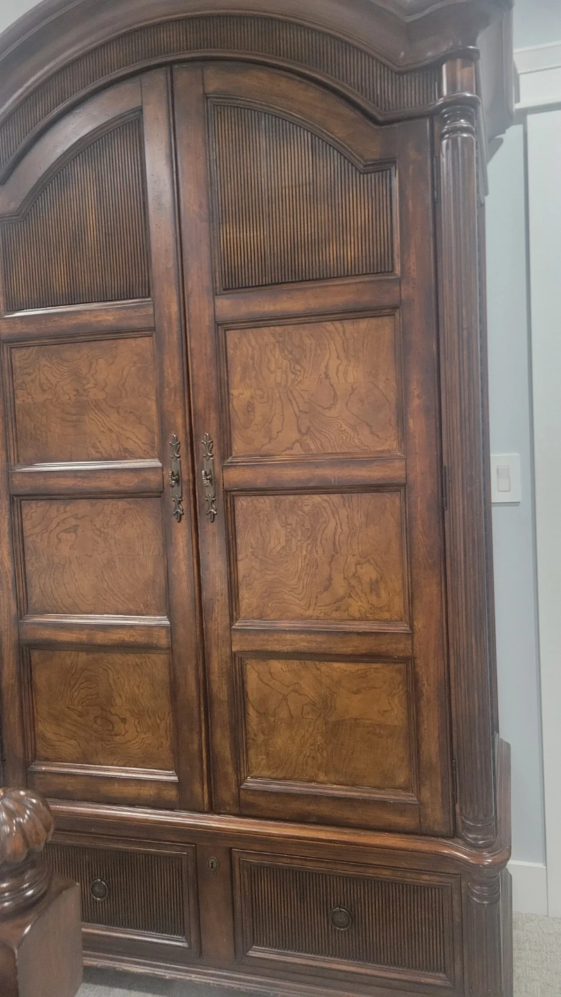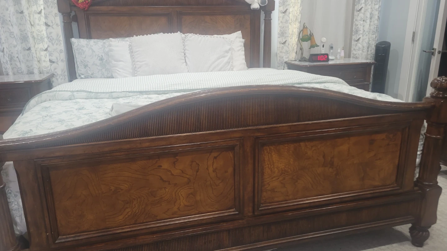 Antique, Solid wood bedroom set in a rich, dark stain. Includes a large armoire with double doors, a king-size bed frame with an arched headboard, footboard, 2 big night tables and a three-drawer dresser. Beautiful wood grain detail throughout. This set offers a classic and elegant look for any bedroom.