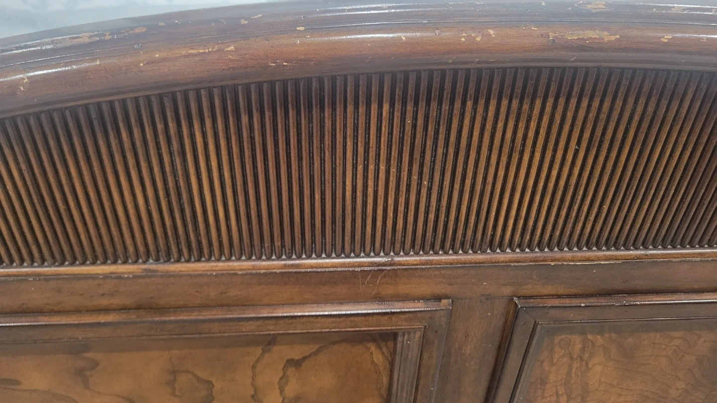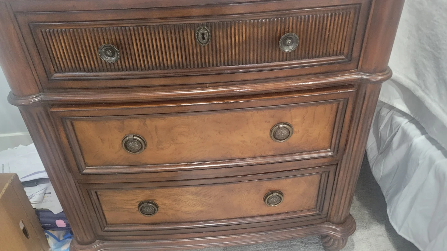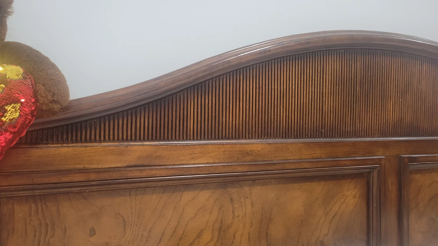 Antique, Solid wood bedroom set in a rich, dark stain. Includes a large armoire with double doors, a king-size bed frame with an arched headboard, footboard, 2 big night tables and a three-drawer dresser. Beautiful wood grain detail throughout. This set offers a classic and elegant look for any bedroom.