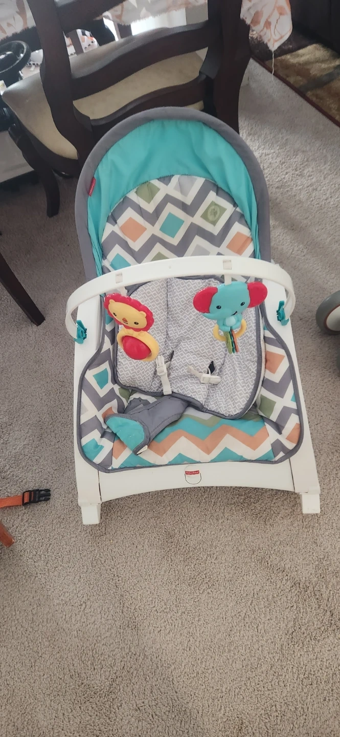 This Fisher-Price baby rocker comes with a comfy seat and engaging toys. It's designed for soothing little ones. The seat pad is removable for easy cleaning.needs cleaning.