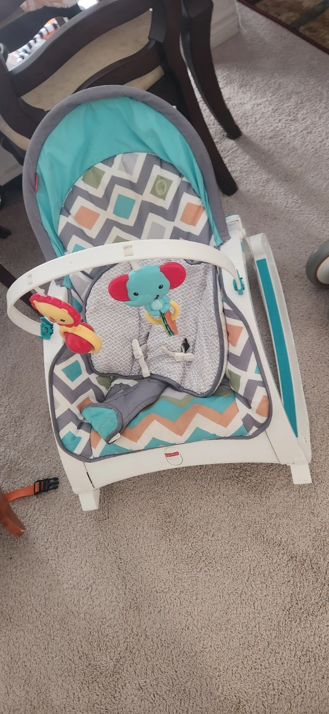 This Fisher-Price baby rocker comes with a comfy seat and engaging toys. It's designed for soothing little ones. The seat pad is removable for easy cleaning.needs cleaning.