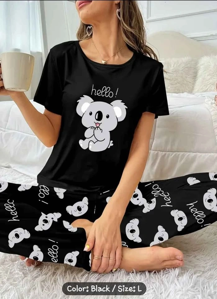 Comfy polyester blend women's cute Koala cartoon print short sleeve and long pants pajama set. Available near Lakeshore and Thirteenth street.