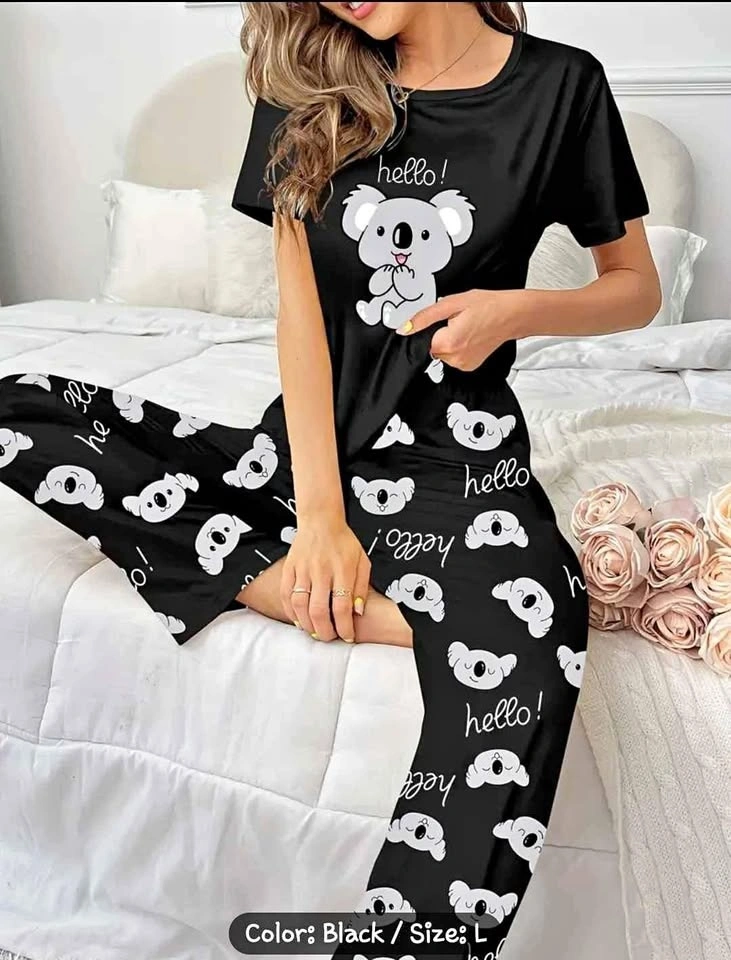 Comfy polyester blend women's cute Koala cartoon print short sleeve and long pants pajama set. Available near Lakeshore and Thirteenth street.