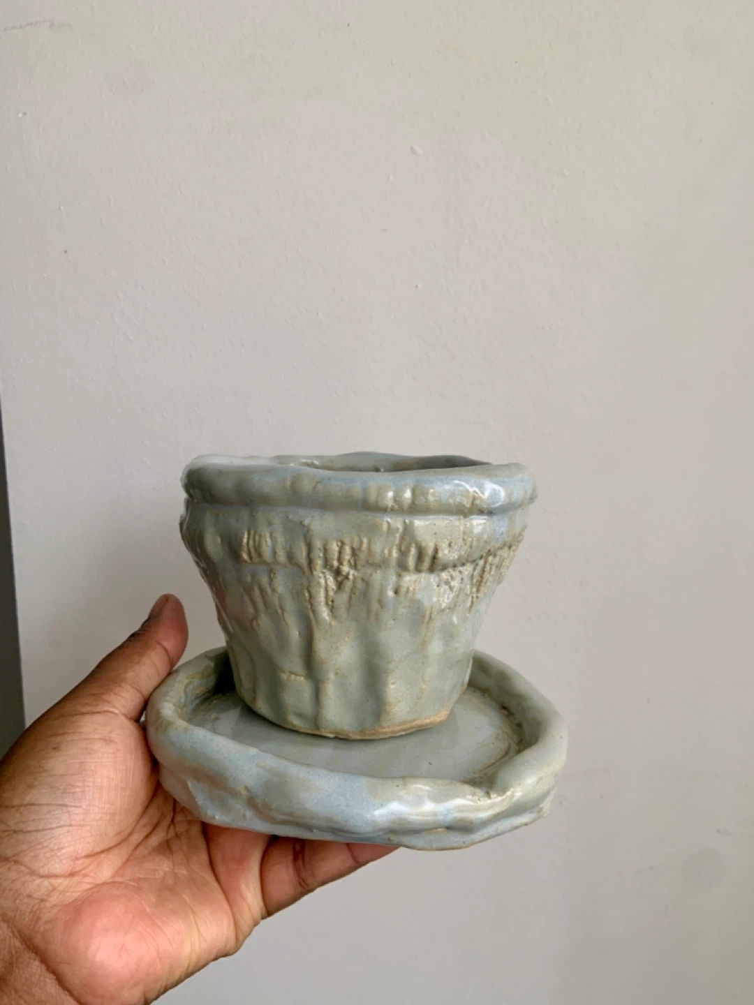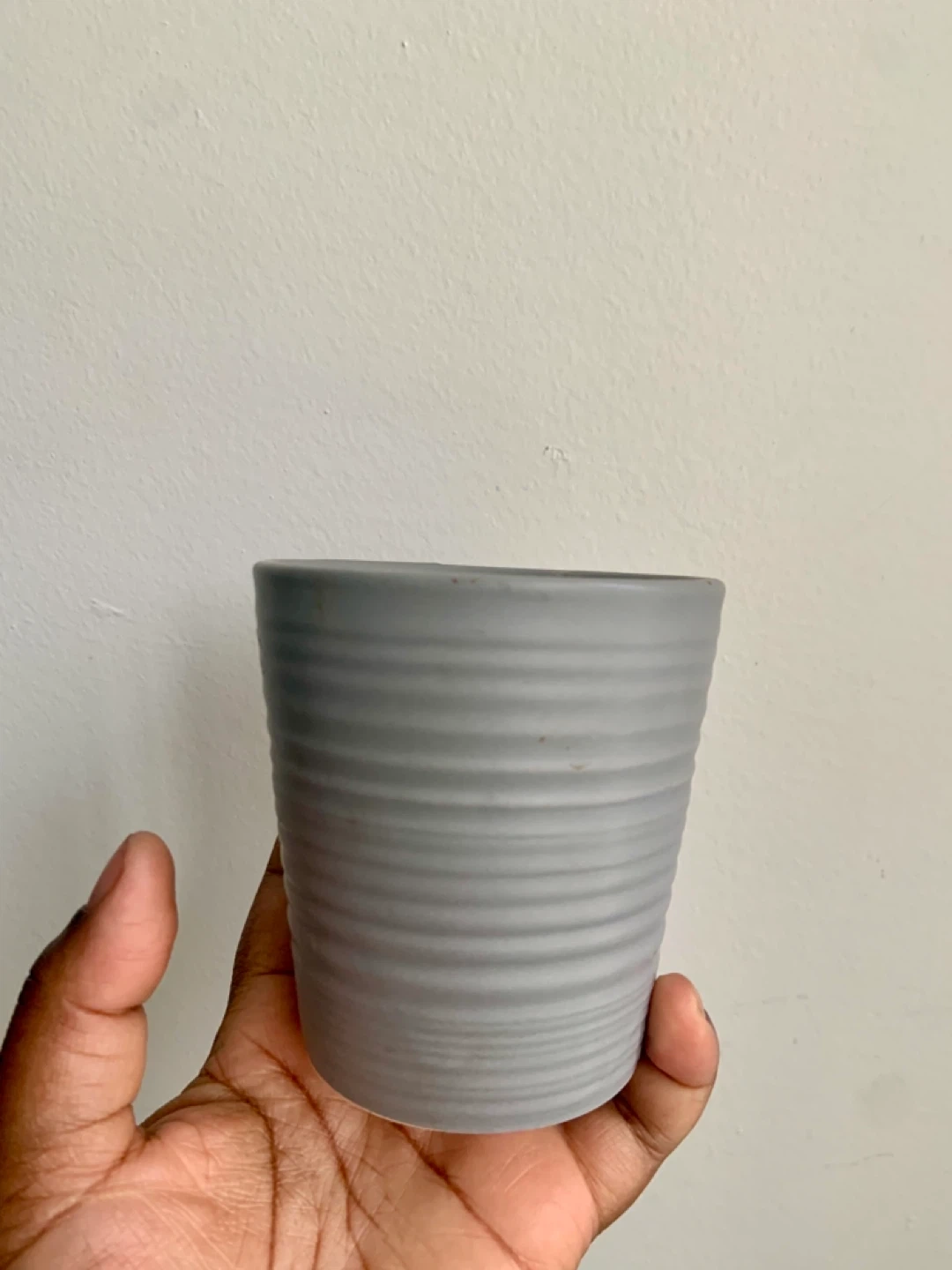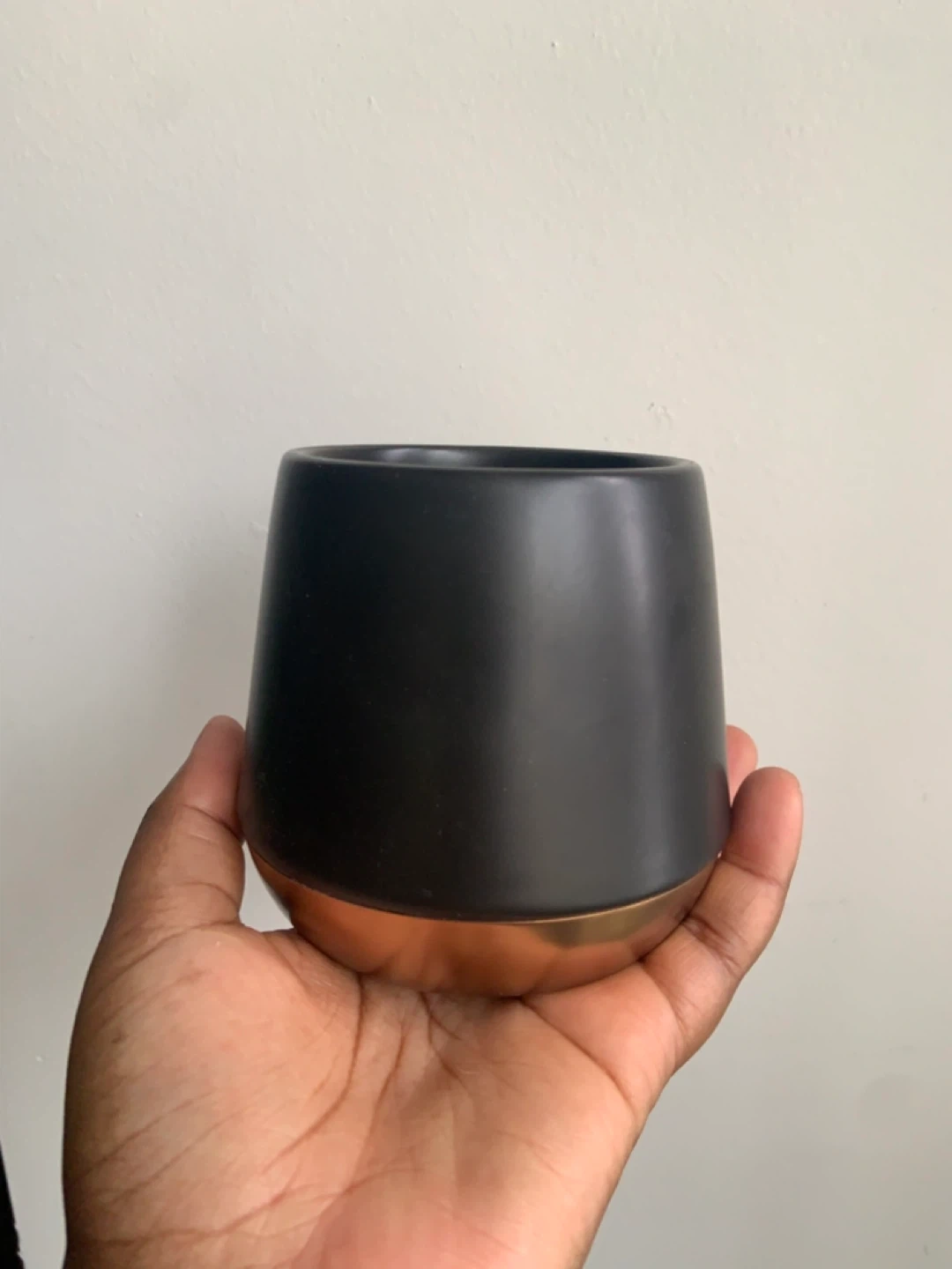 Selling a a collection of five different plant pots and planters. Includes a white ceramic round pot, a grey ribbed cup planter, a black and copper accented pot, a light green textured pot with saucer, and a large green plastic planter. Various materials and styles for your greenery!