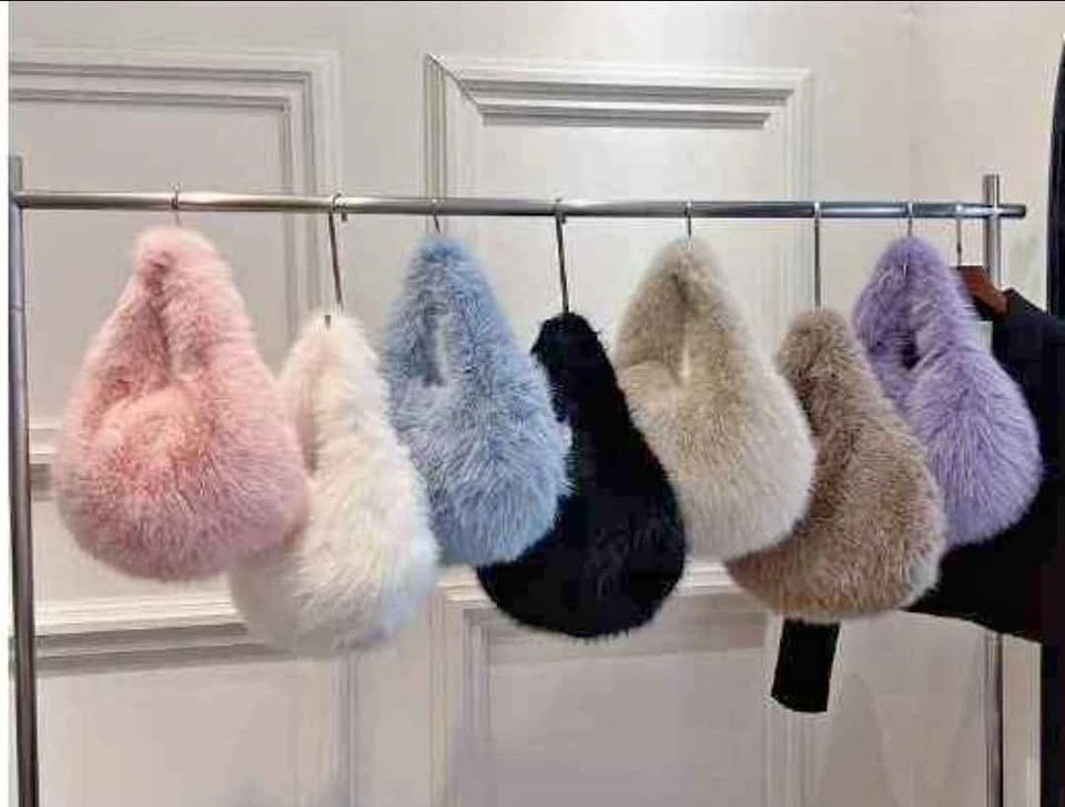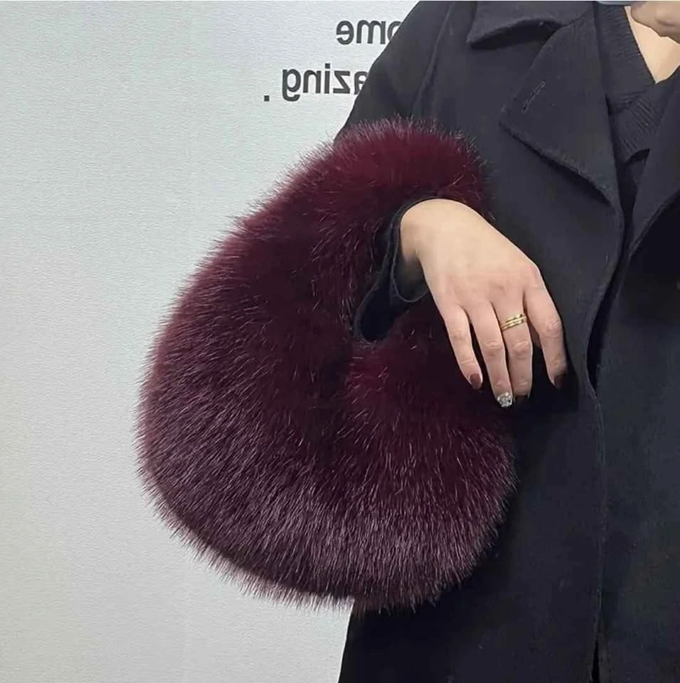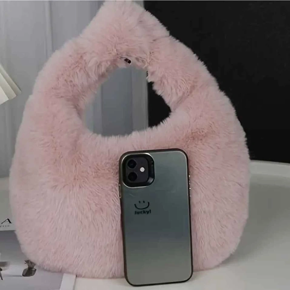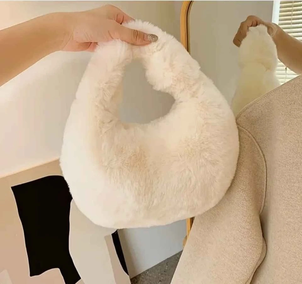 Elegant Women's Plush Handbag - Chic Faux Fur Crescent Bag with Zipper Closure, Solid Color, Perfect for all occasions. Available at Lakeshore and Thirteenthstreet.
