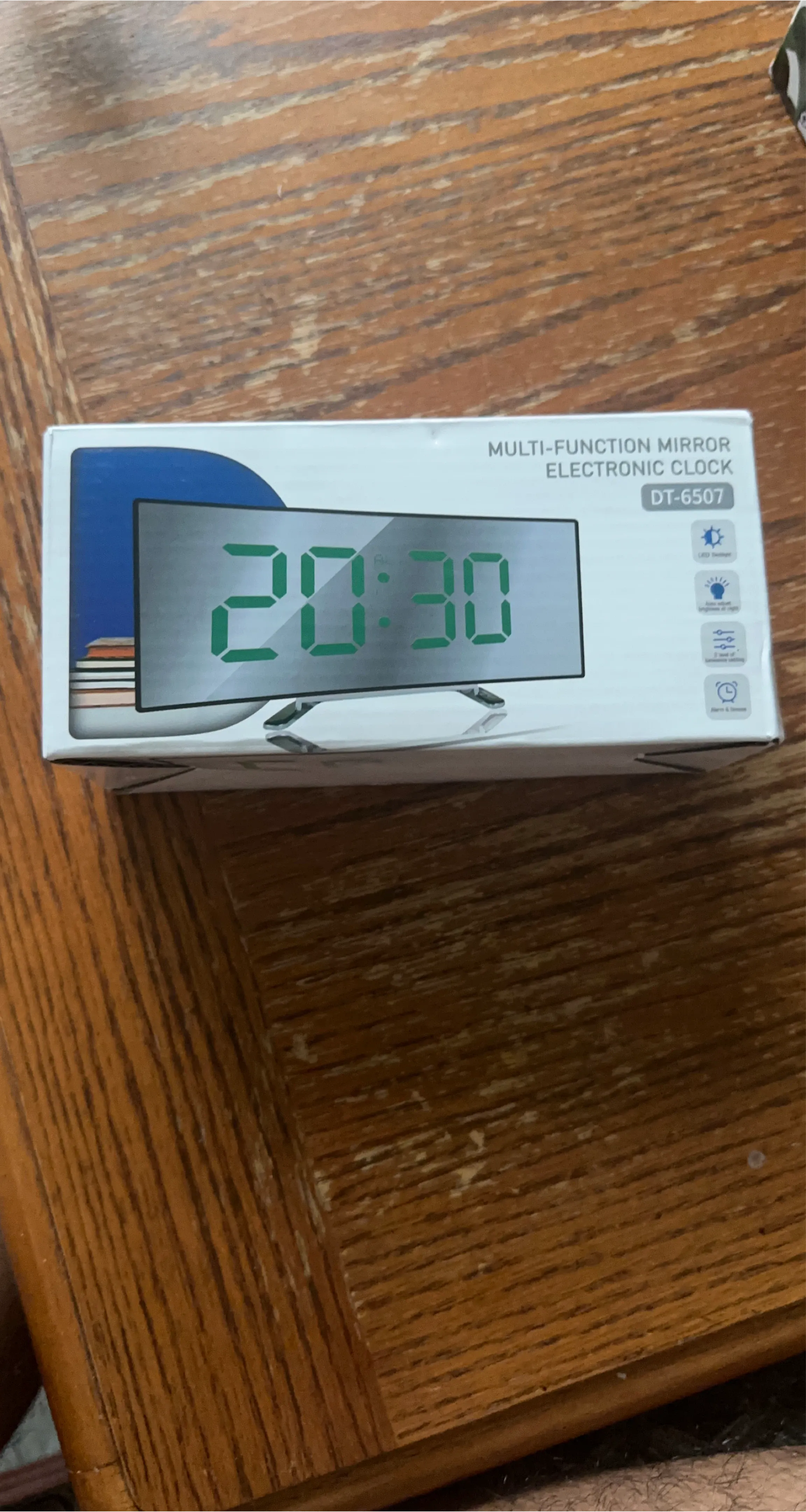 This is a multi-function mirror electronic clock, model DT-6507. It features an alarm and snooze function. It displays time in 12 or 24-hour format and has two brightness settings. It also includes a USB cable and temperature display in Celsius.