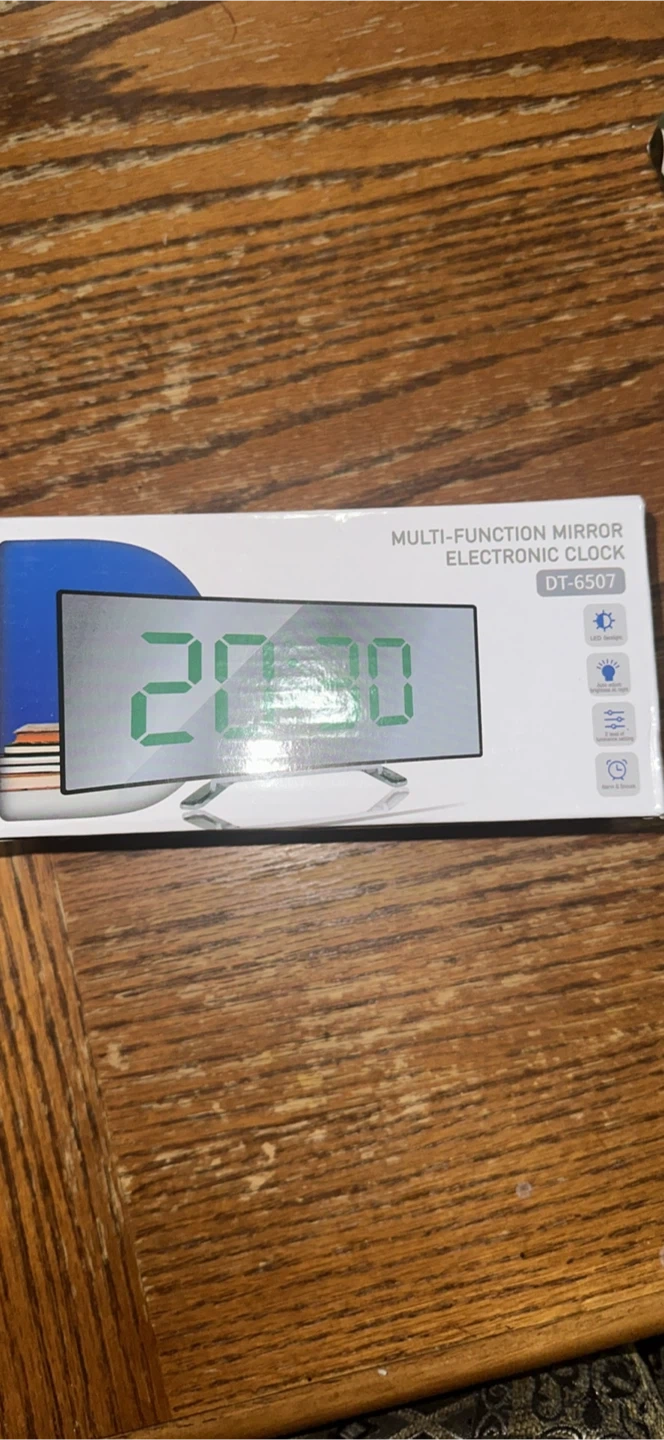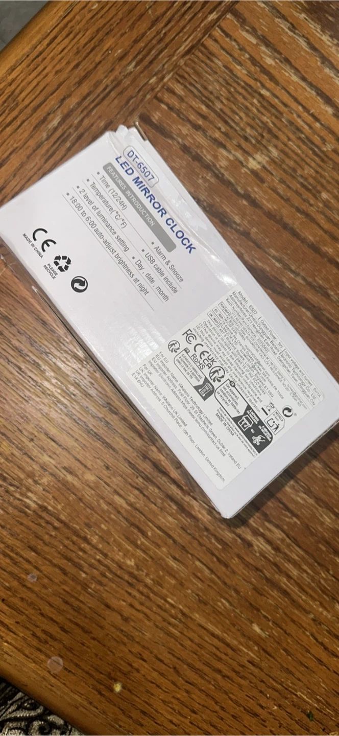 This is a multi-function mirror electronic clock, model DT-6507. It features an alarm and snooze function. It displays time in 12 or 24-hour format and has two brightness settings. It also includes a USB cable and temperature display in Celsius.