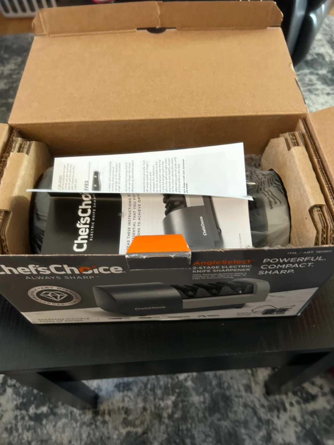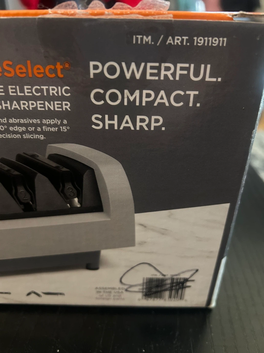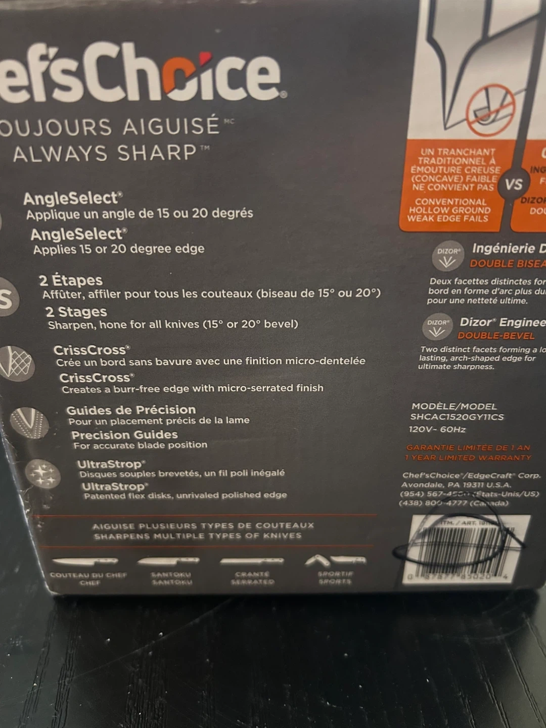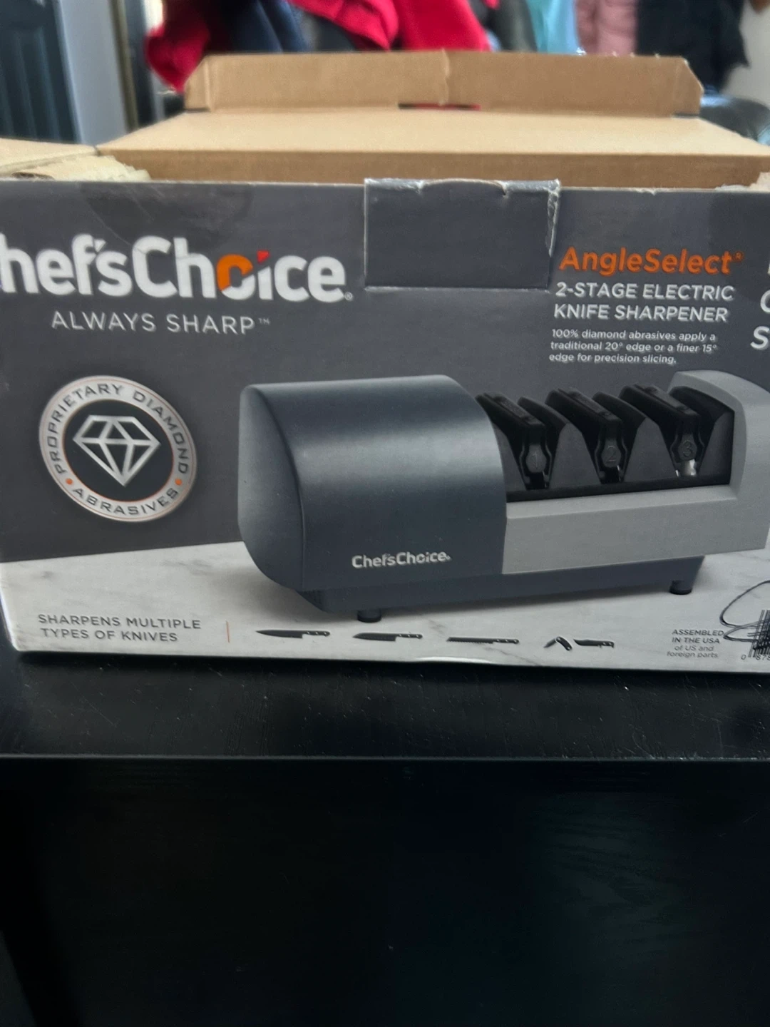 This Chef'sChoice electric knife sharpener features a 2-stage sharpening system with AngleSelect technology for 15 or 20-degree edges. It uses 100% diamond abrasives to apply a precise edge for sharp cutting. Sharpens multiple types of knives with precision guides.