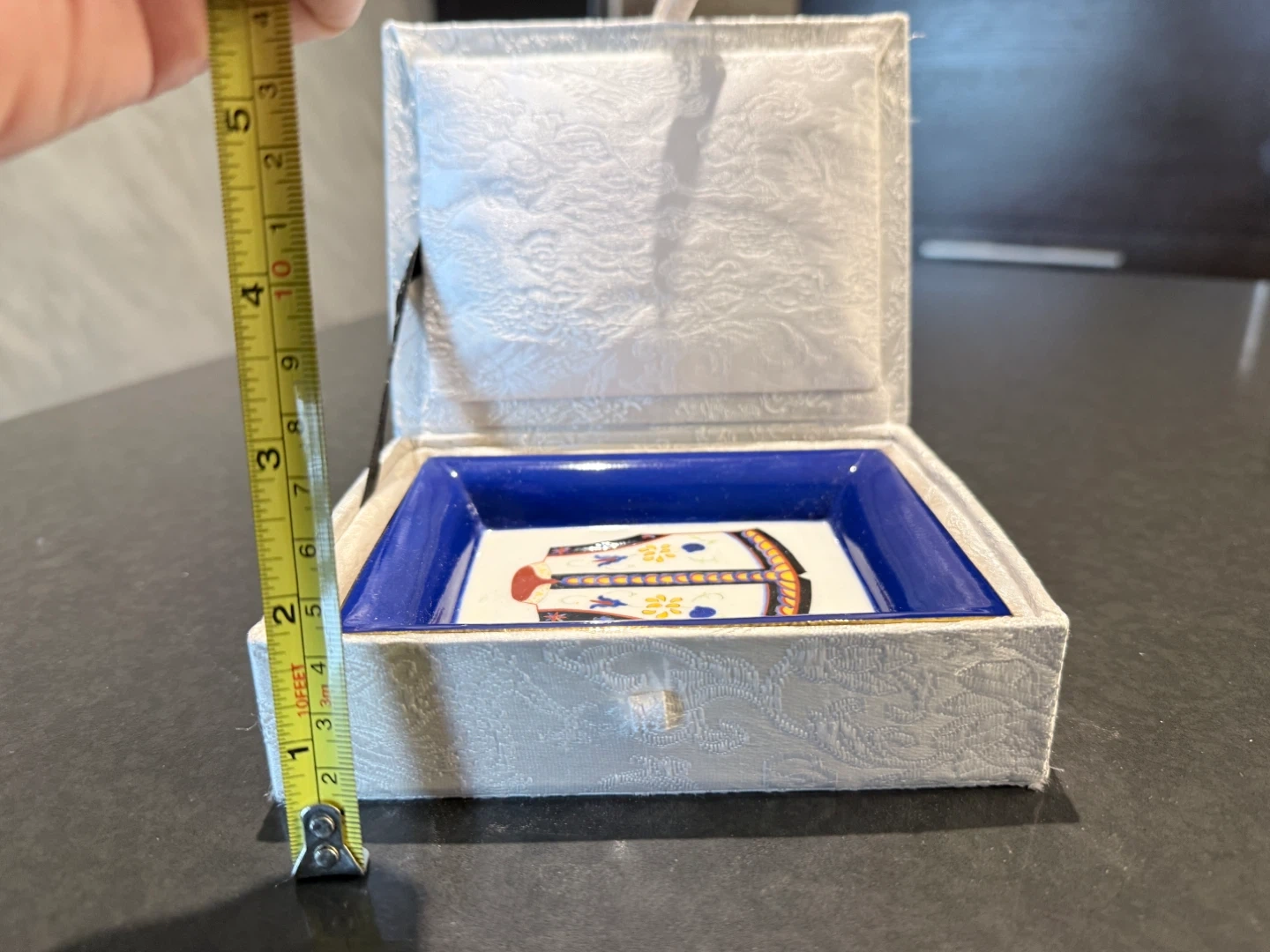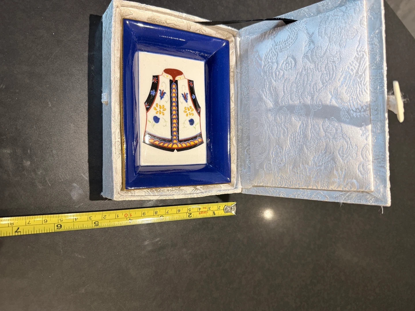 A decorative ceramic trinket dish from Shanghai Tang, featuring a vibrant traditional vest motif. It's perfect for holding small items like rings or earrings. Includes its original decorative box.