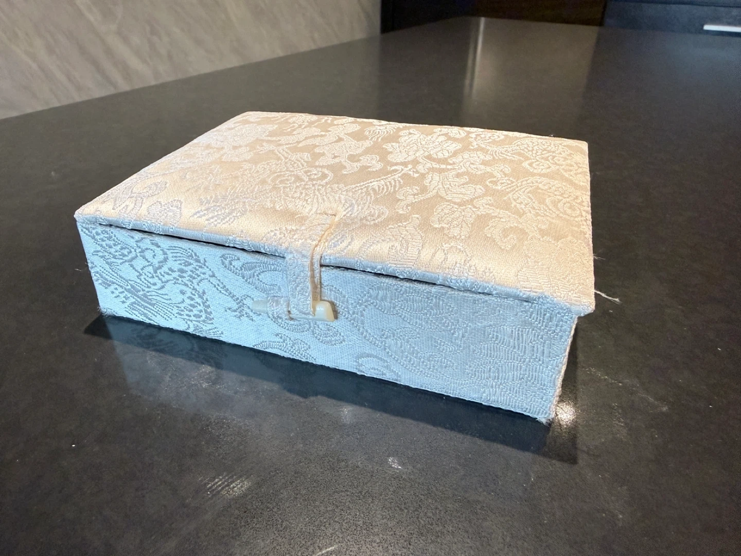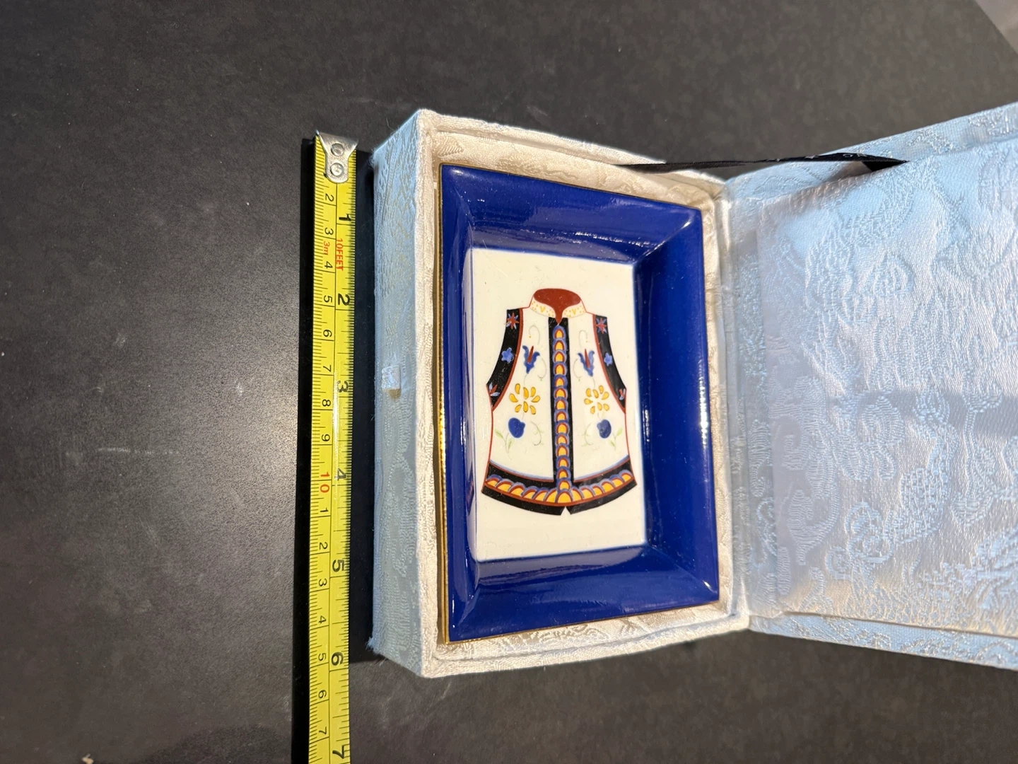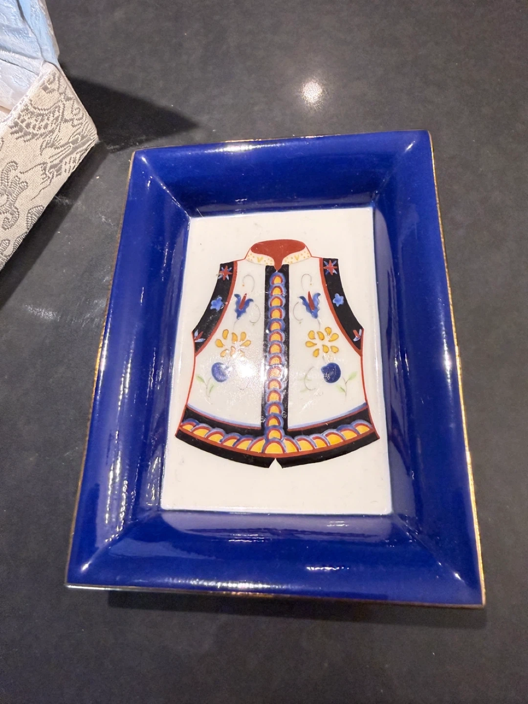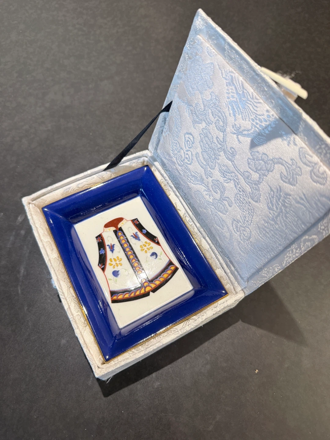 A decorative ceramic trinket dish from Shanghai Tang, featuring a vibrant traditional vest motif. It's perfect for holding small items like rings or earrings. Includes its original decorative box.
