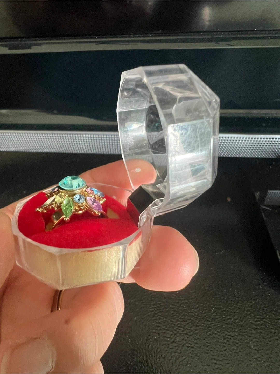 This ring features a large, light blue central gemstone surrounded by smaller colourful stones in a floral-like design. It's presented in a clear, faceted display case with a red velvet lining. It's quite eye-catching! Pick up