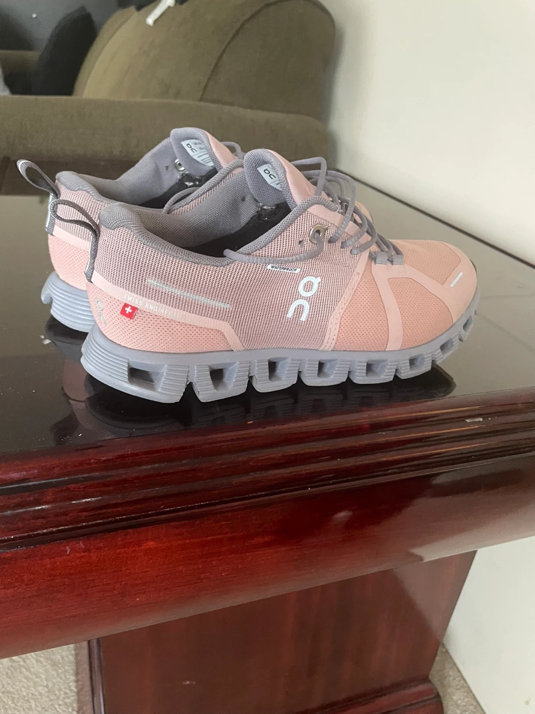 These are a pair of pink On Cloud running shoes. They are waterproof and feature the distinctive sole design. These shoes are designed for running and active use.