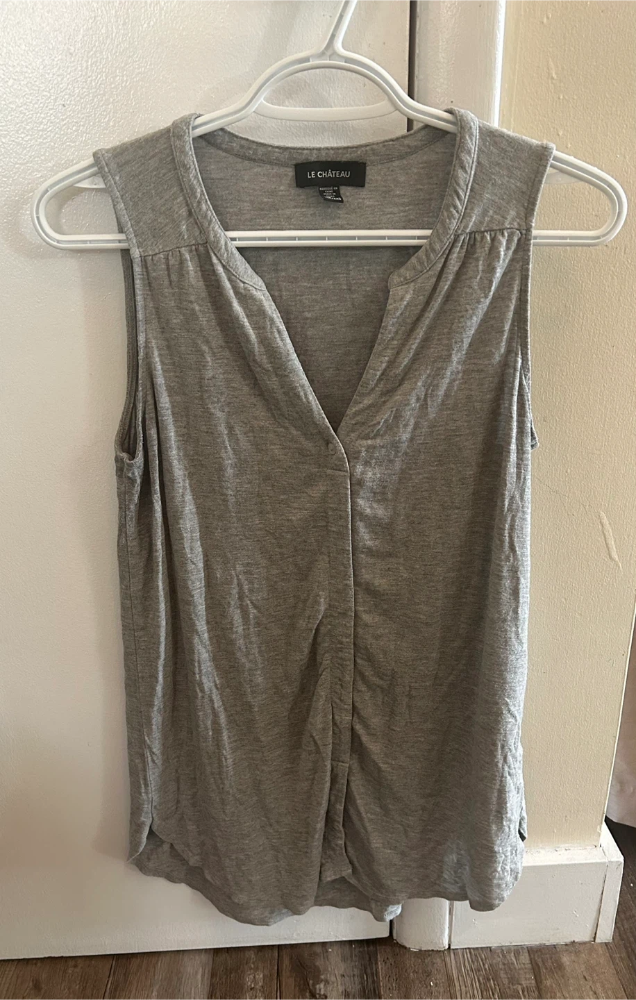 Grey sleeveless top from LE CHÂTEAU. It has a V-neck with a button-up detail. Material is soft and breathable. Easy to dress up or down!
