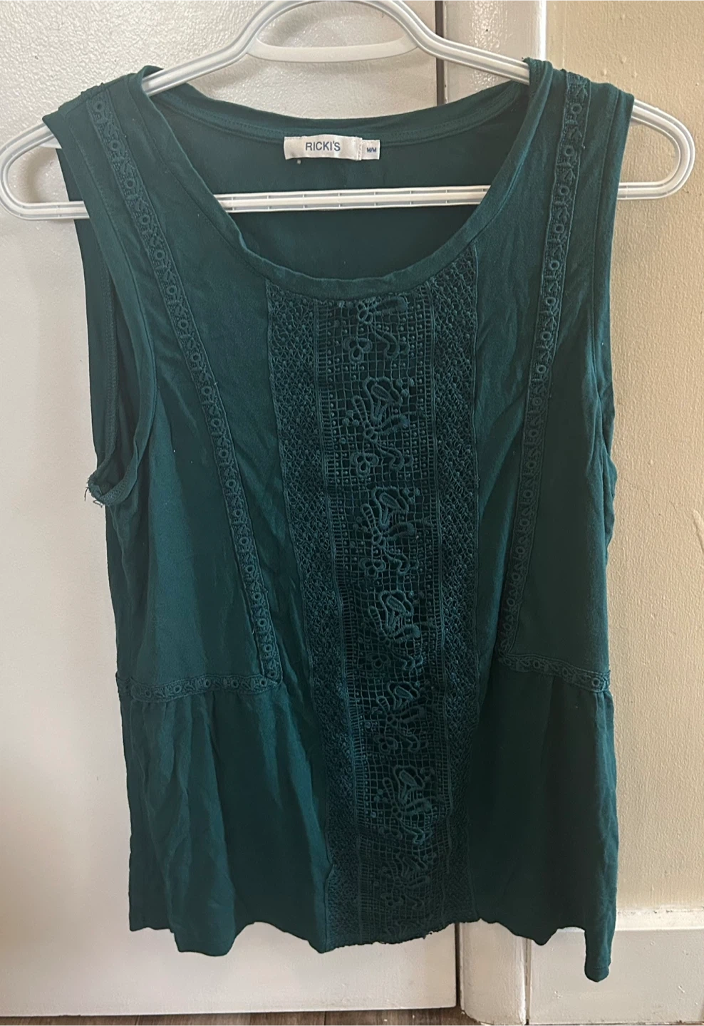 This is a teal sleeveless top from Ricki's. It features a decorative lace panel down the front. Size is M/M.