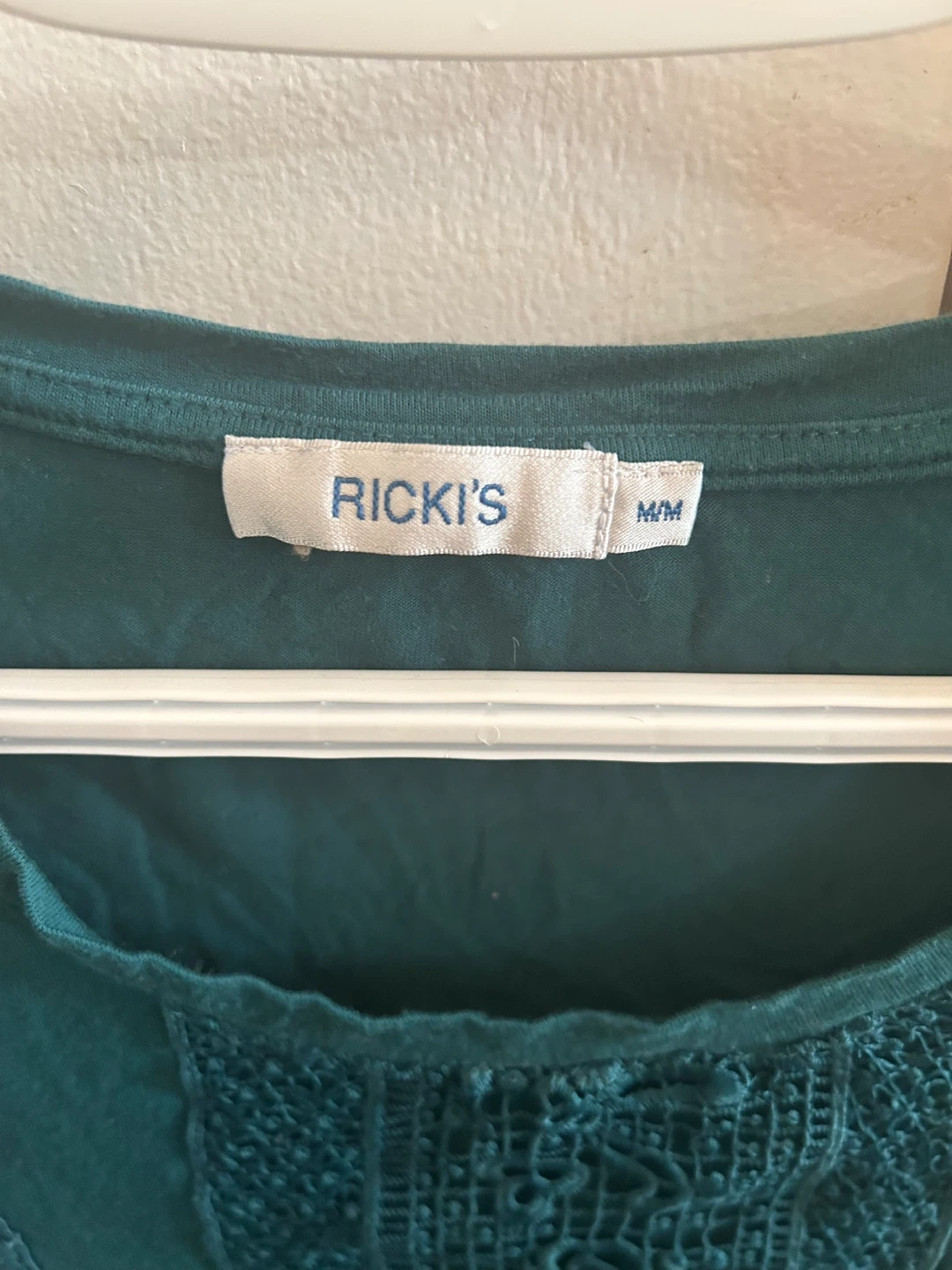 This is a teal sleeveless top from Ricki's. It features a decorative lace panel down the front. Size is M/M.