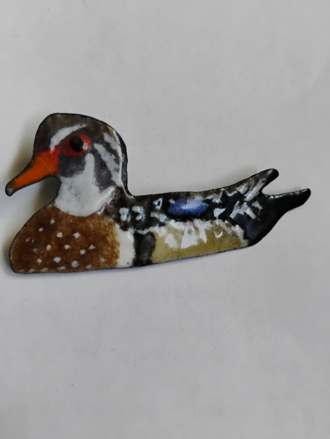 This is a lovely enamel brooch , pin / shaped like a duck. It features a colourful design with detailed painting. It attaches securely with a pin back.