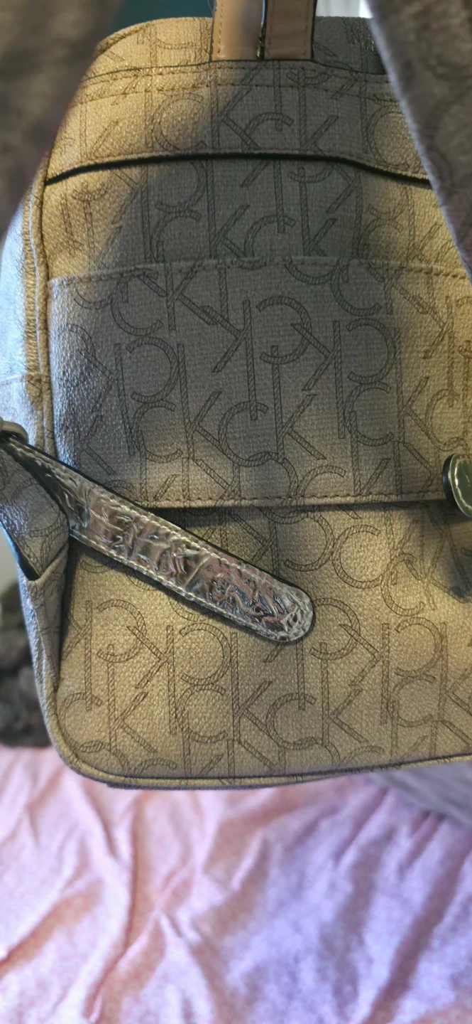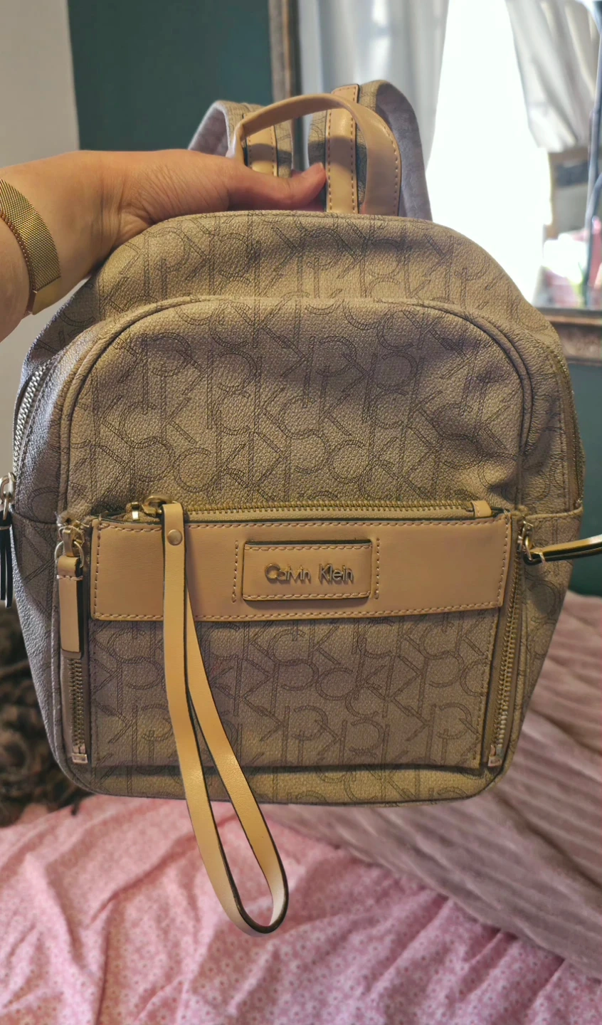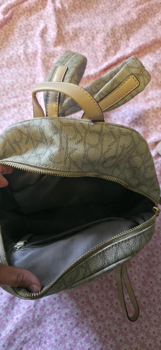This is a Calvin Klein backpack with a monogram pattern. It has a beige and tan colour scheme. Plenty of space for your essentials!