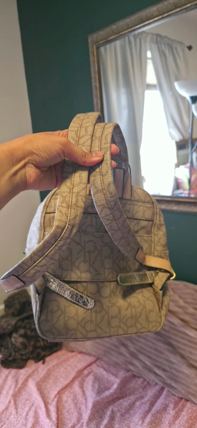 This is a Calvin Klein backpack with a monogram pattern. It has a beige and tan colour scheme. Plenty of space for your essentials!