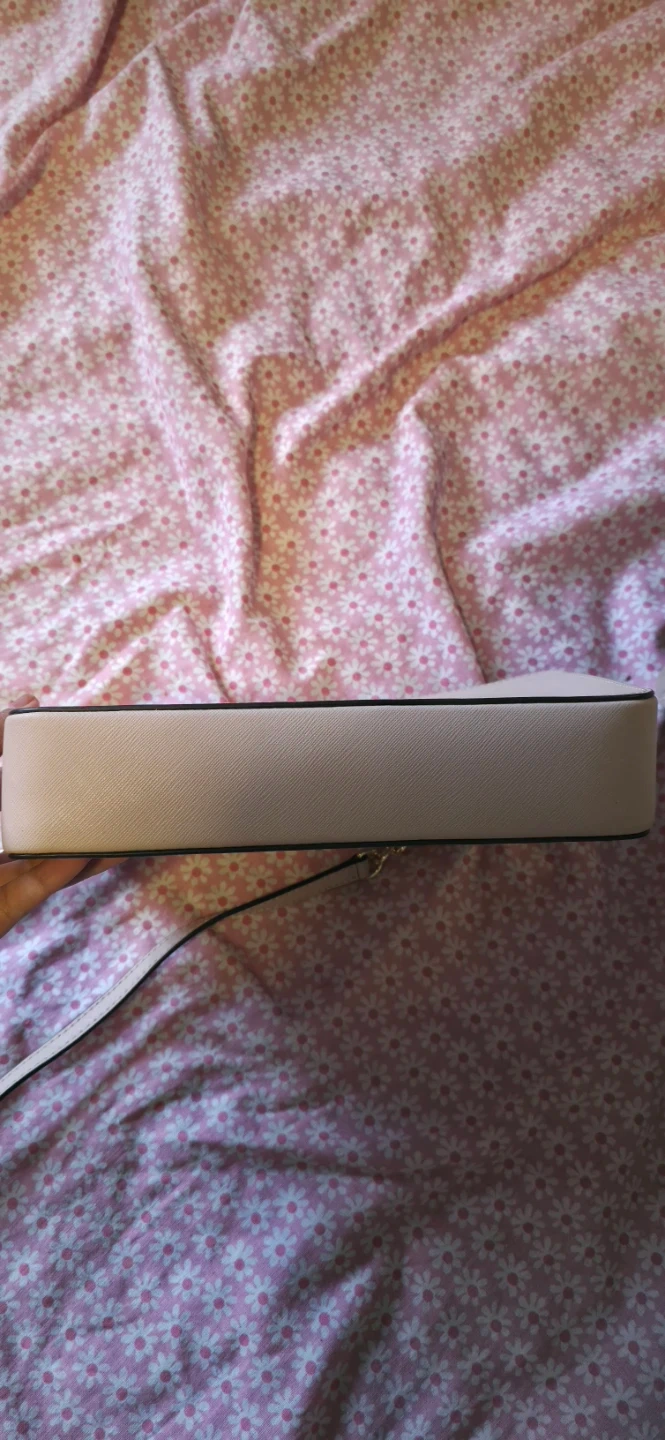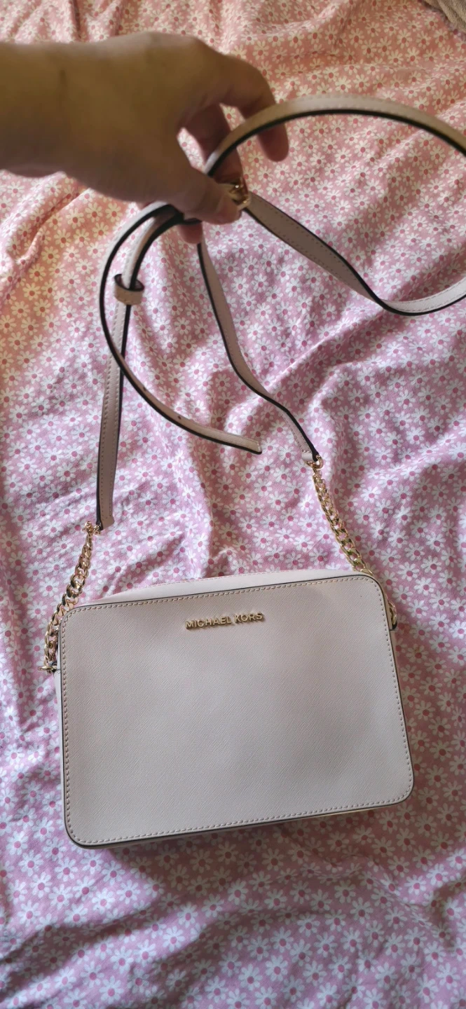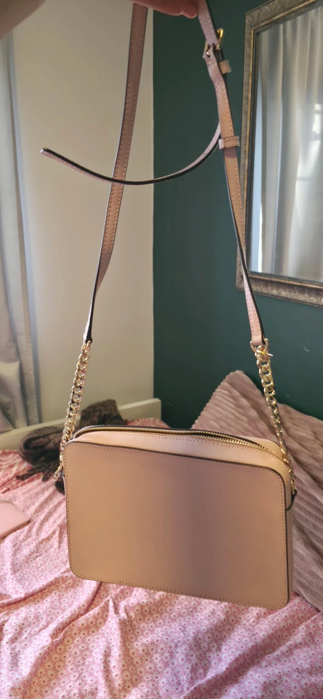 This is a light pink leather crossbody bag from Michael Kors. It has a zip closure and an adjustable strap with chain detailing. The interior features multiple compartments.