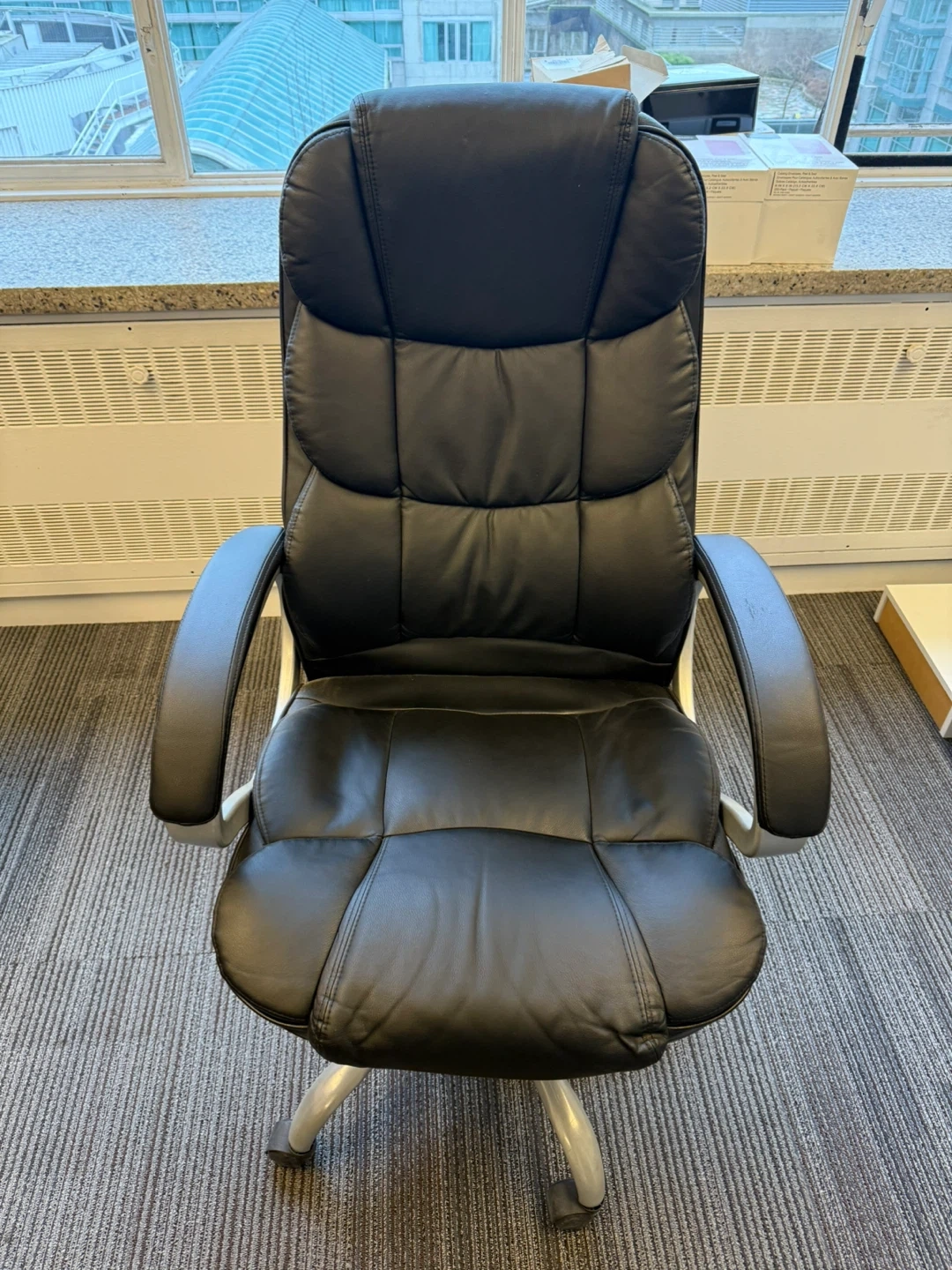 Very Comfortable black PU leather office chair with padded seat and back. It has adjustable height and swivel base with casters for easy mobility. This chair is suitable for home or office use.