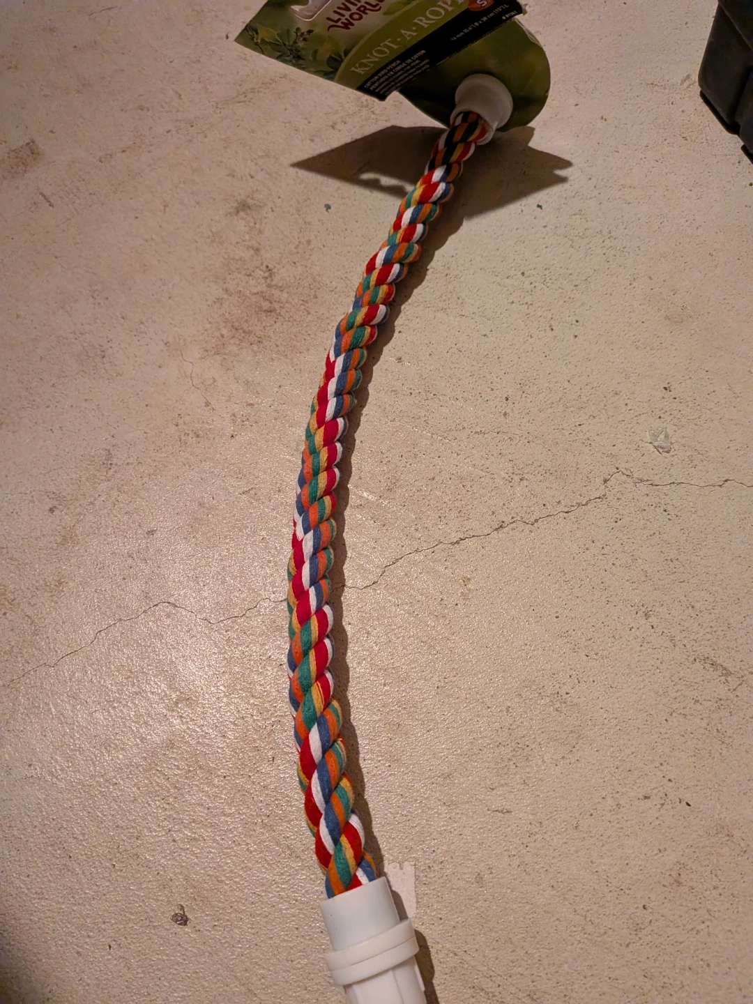 Living World Knot-A-Rope cotton bird perch. It's a size S perch, measuring 16 mm in diameter and 38 cm in length. This perch is made of cotton.