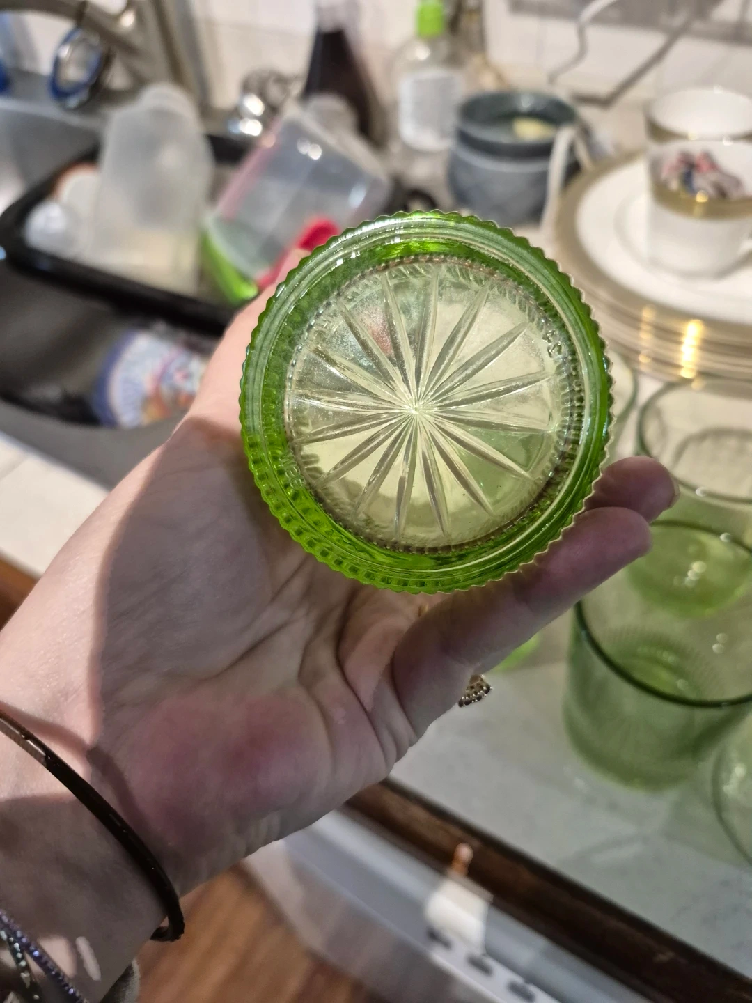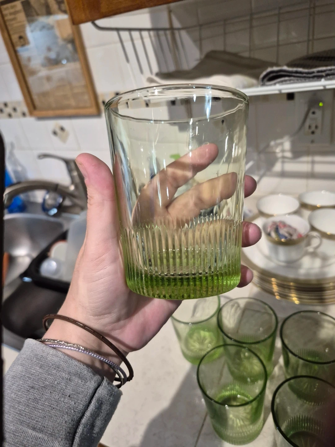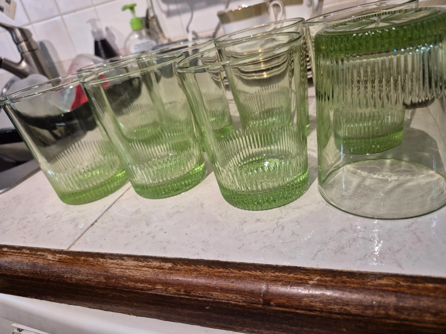 A set of six green glass tumblers with a ribbed design. These glasses have a translucent green tint and a patterned base. They're perfect for everyday use or special occasions!