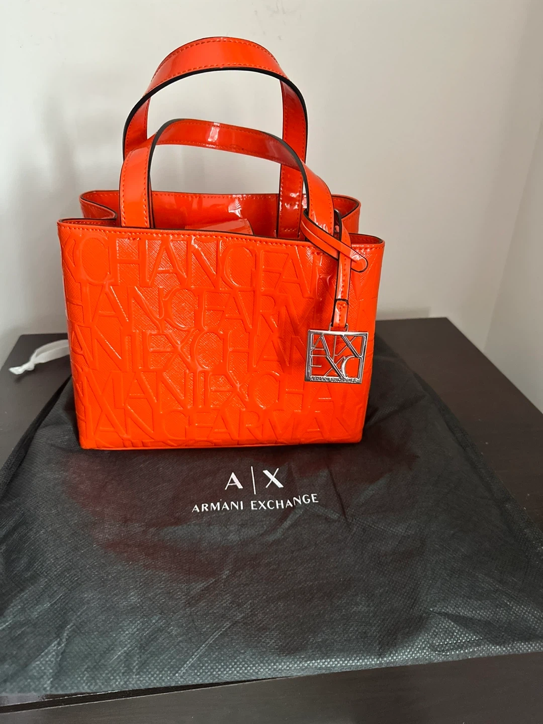 Bright orange patent tote bag with embossed Armani Exchange logo. It features dual top handles and includes a dust bag. Great for adding a pop of colour!