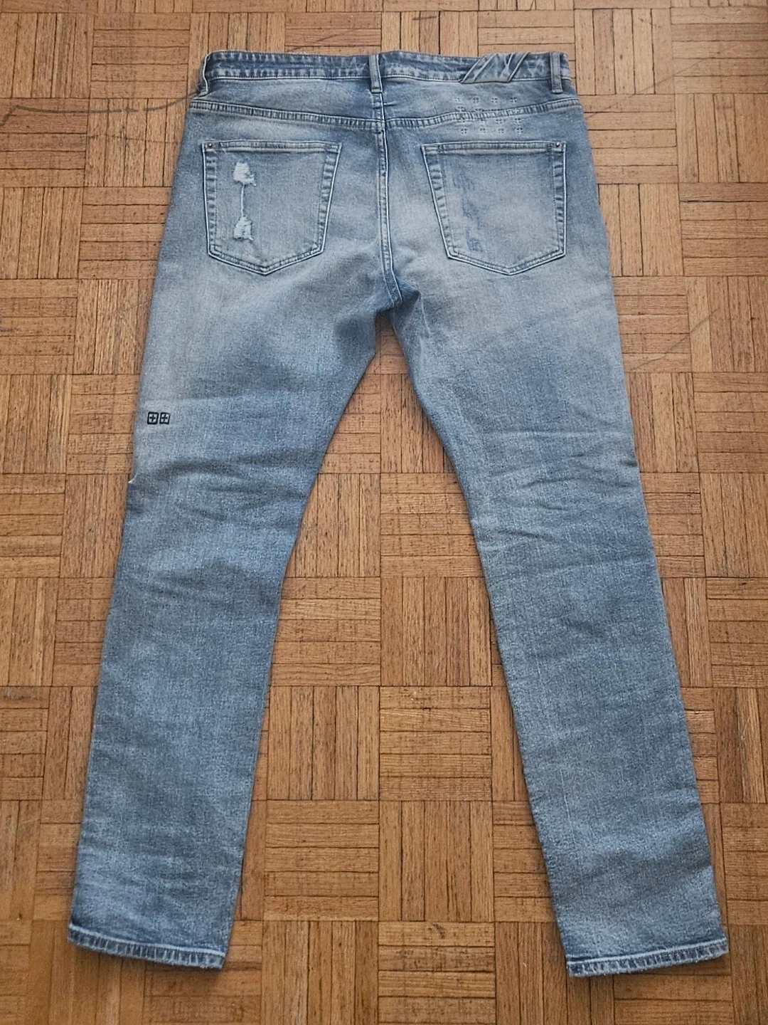 The jeans are size 34W in Men's, the jeans have zero flaws or any damages, the jeans are 100% authentic from Heatcheck Toronto, the jeans have all tags inside and size labelling with no fading, the jeans NO LONGER COME WITH THE BLACK HANG-TAG OR CARDBOARD TAG ON THE FRONT OR BACK, and the jeans fit true to size.
