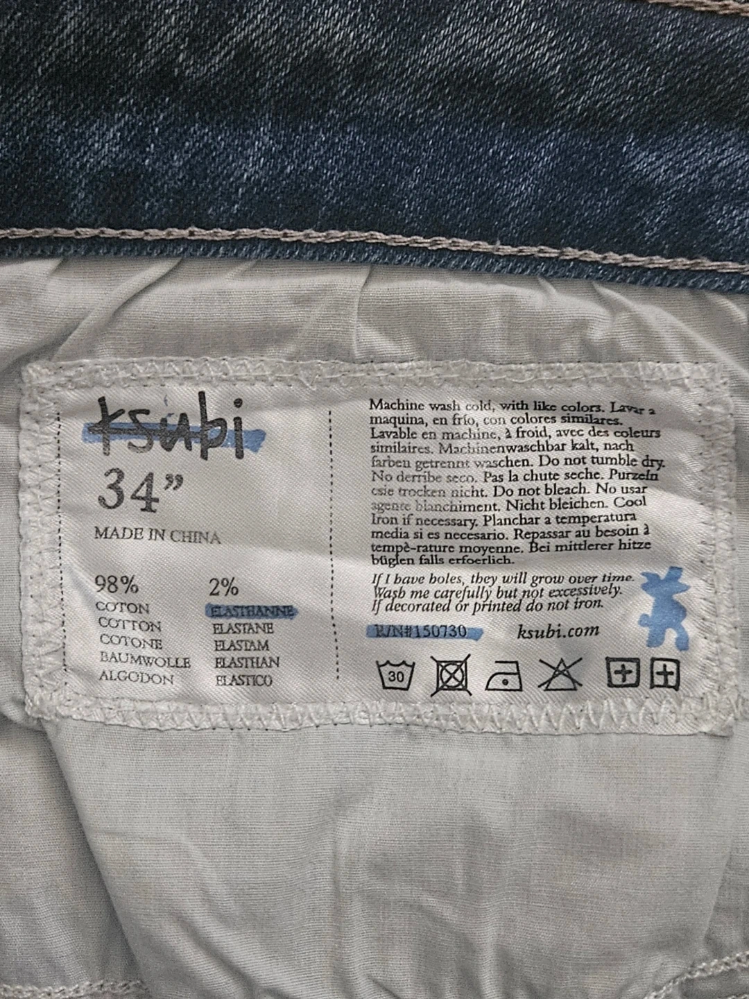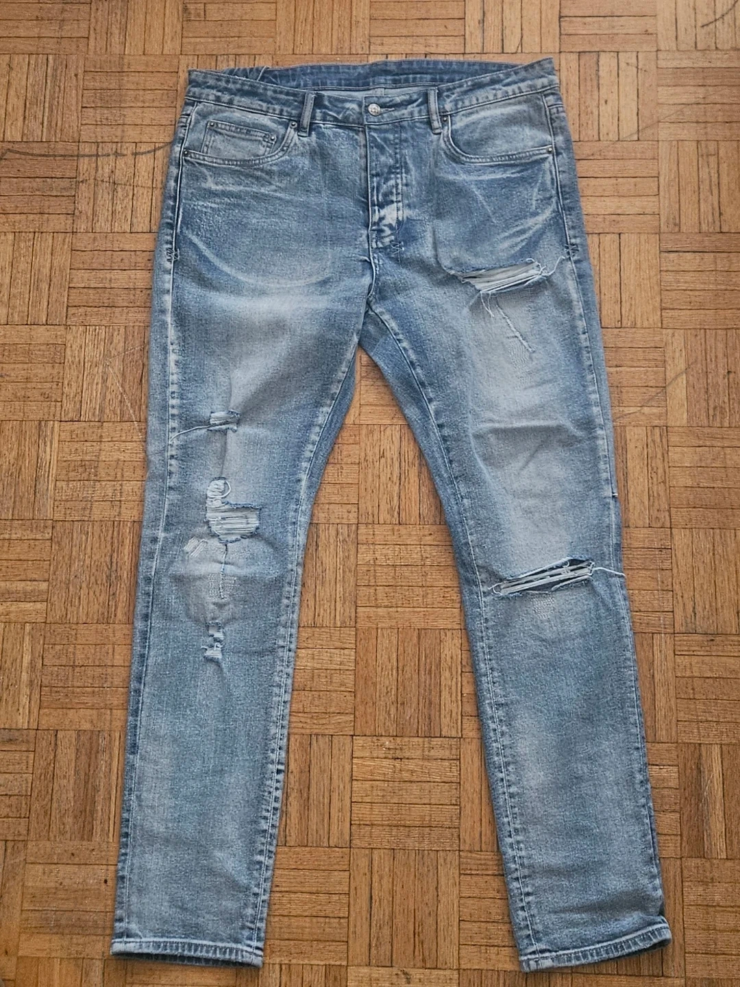 The jeans are size 34W in Men's, the jeans have zero flaws or any damages, the jeans are 100% authentic from Heatcheck Toronto, the jeans have all tags inside and size labelling with no fading, the jeans NO LONGER COME WITH THE BLACK HANG-TAG OR CARDBOARD TAG ON THE FRONT OR BACK, and the jeans fit true to size.