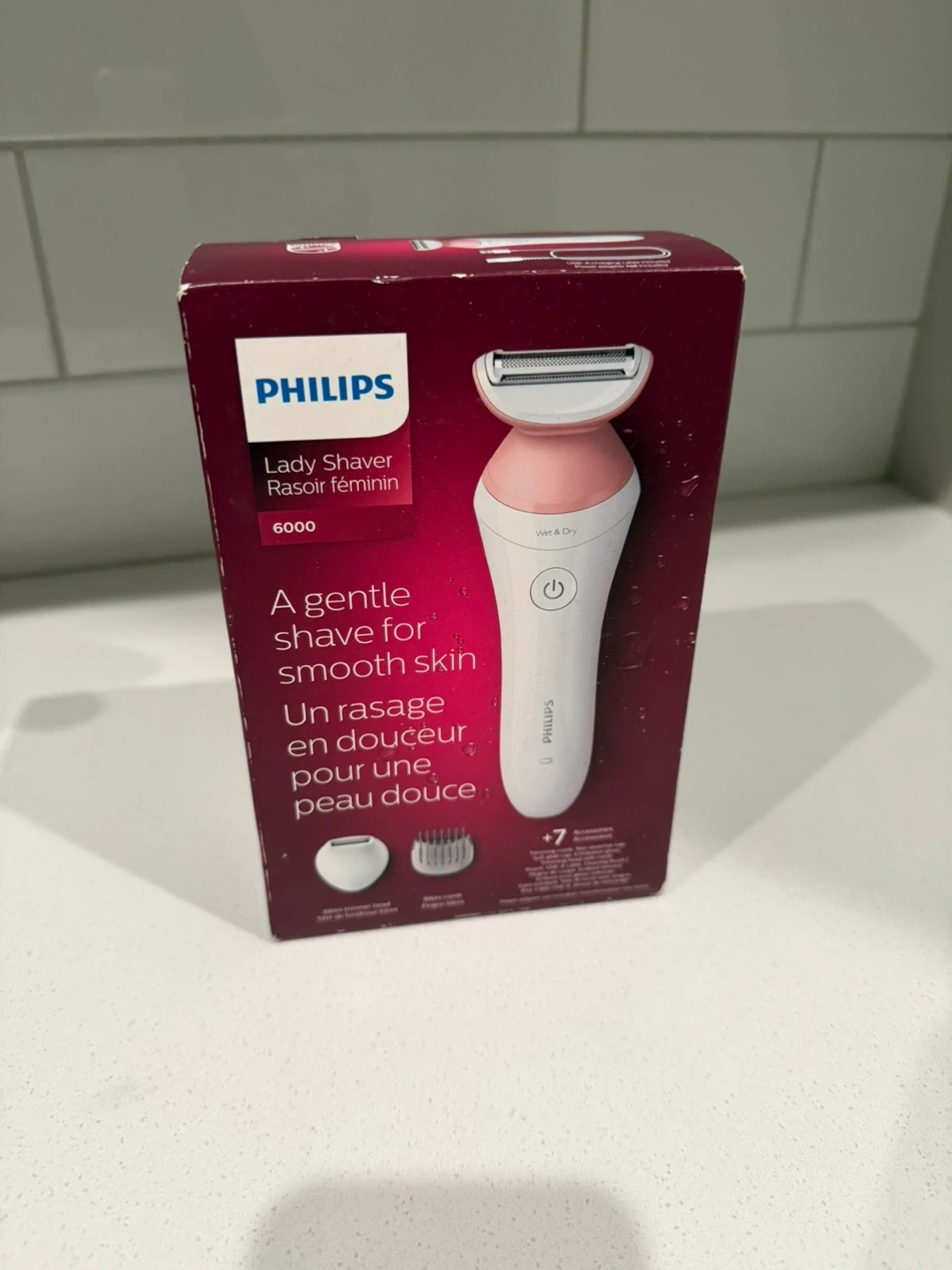 This is a Philips Lady Shaver 6000. It's designed for a gentle shave for smooth skin. It's wet & dry, and comes with +7 accessories. This would be useful for quick touch-ups or travel.