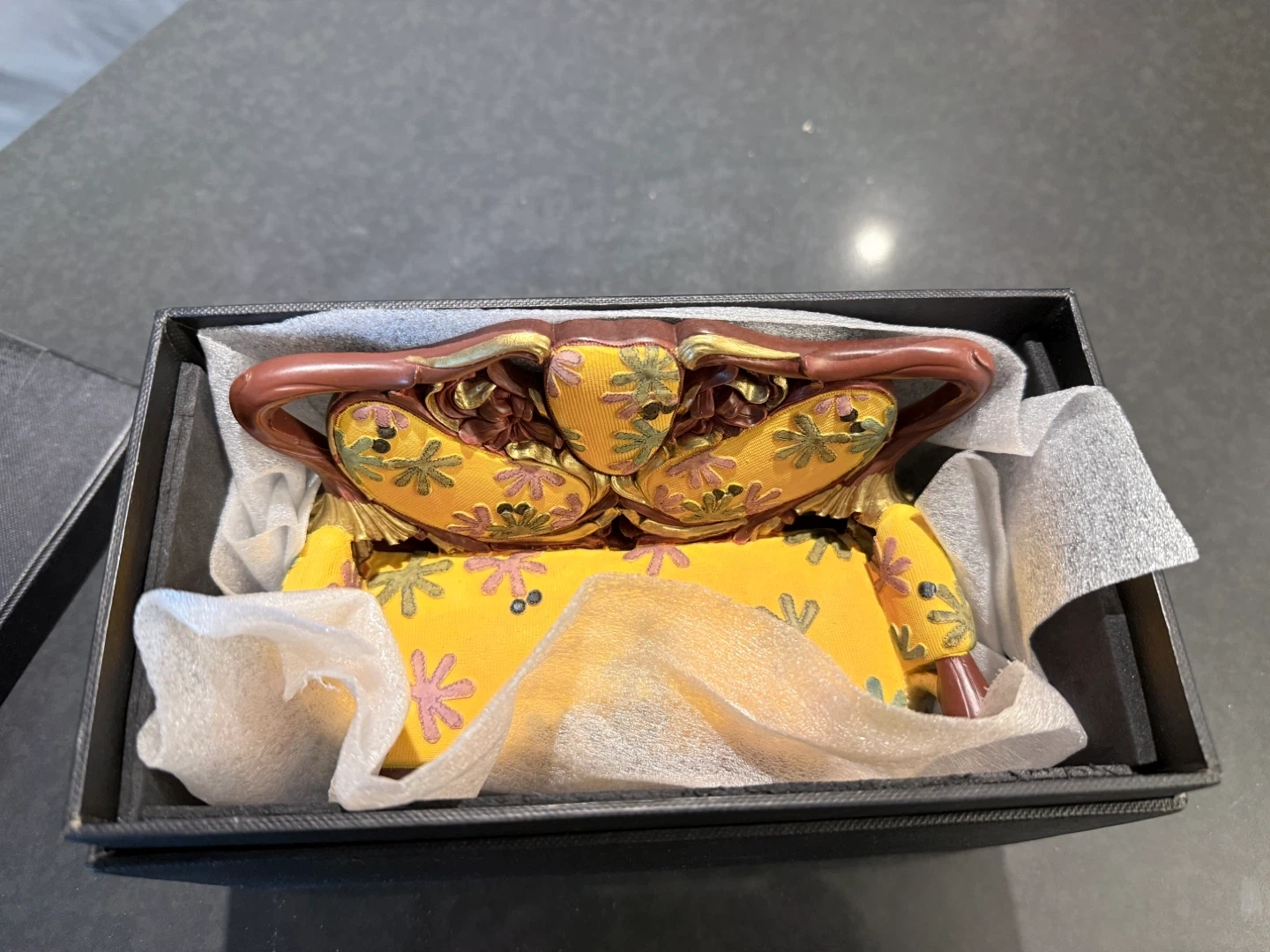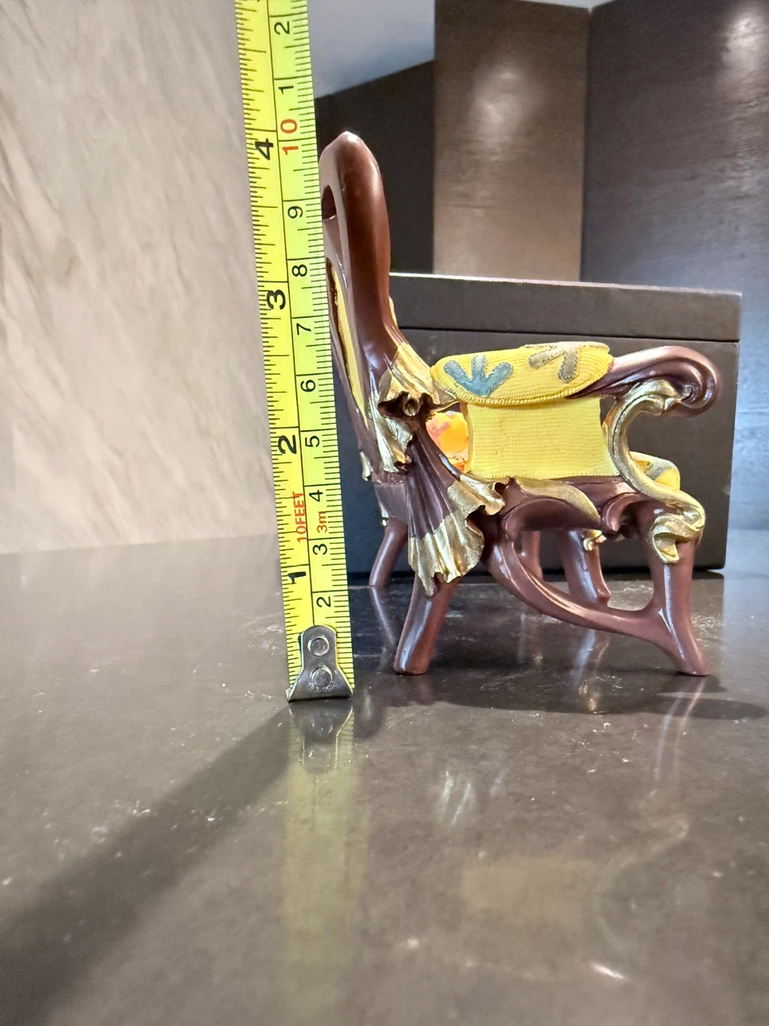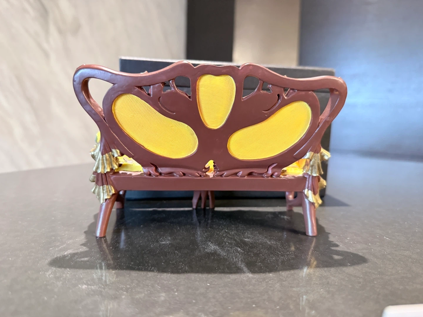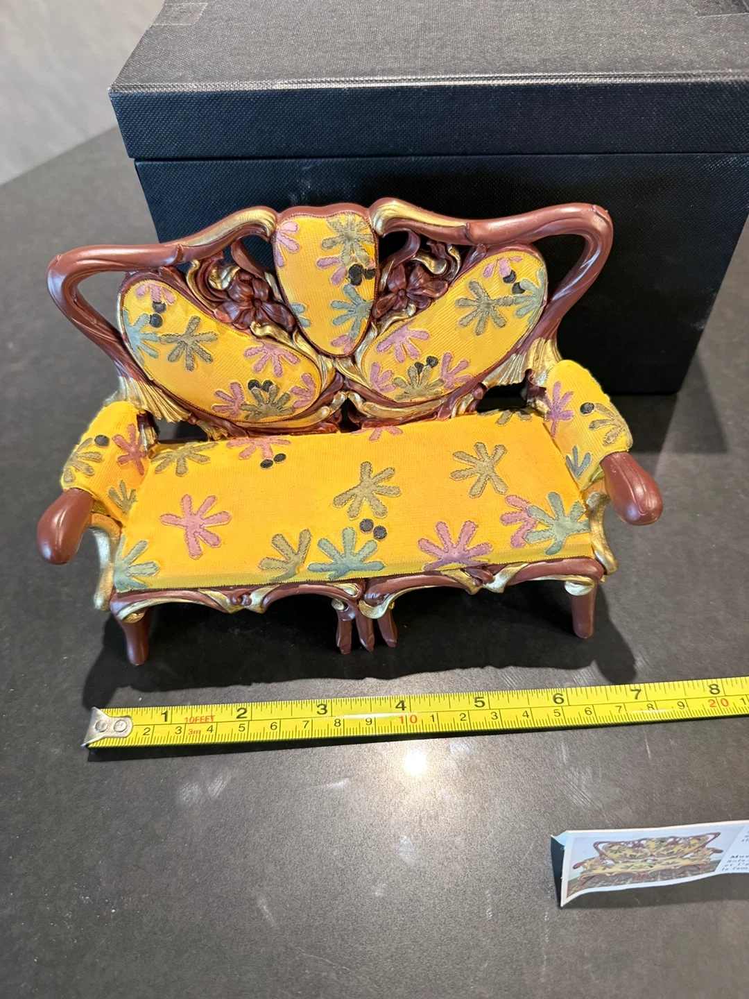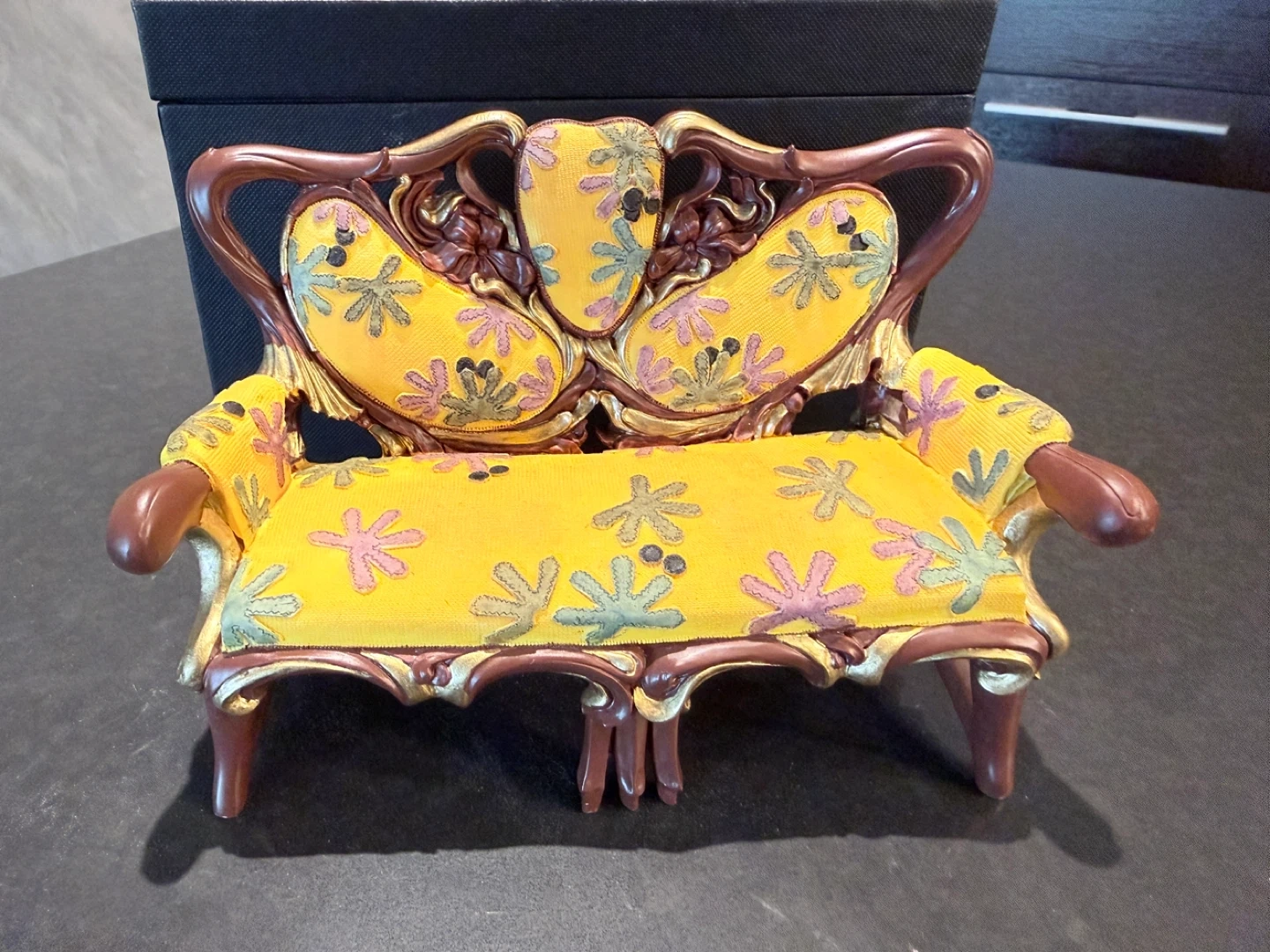 This is a rare miniature sofa piece designed by Gaudí, inspired by the painter Alice Clapés. It's a decorative piece for collectors or fans of Gaudí's work. The sofa measures approximately 6 inches wide and 4 inches tall.