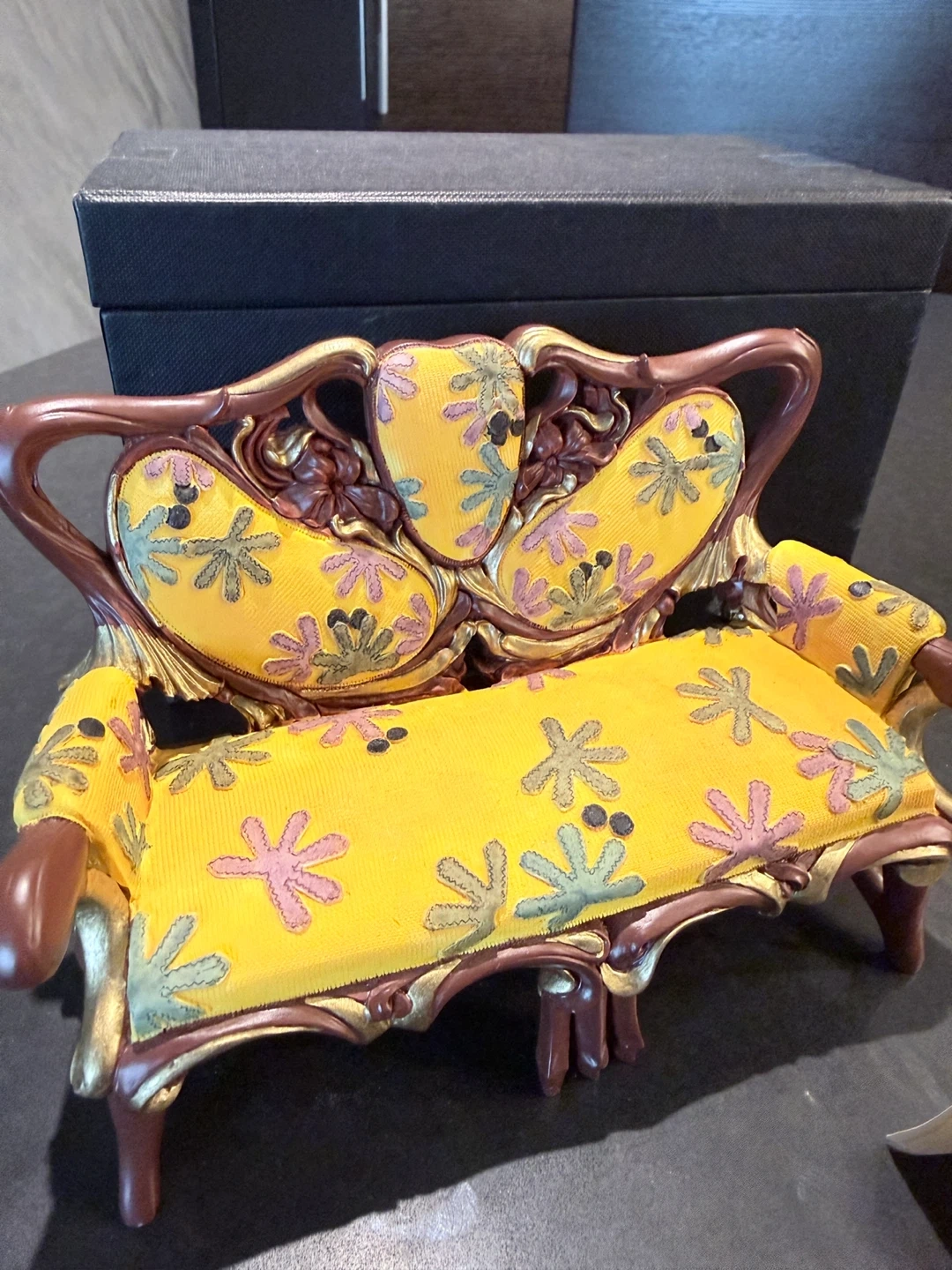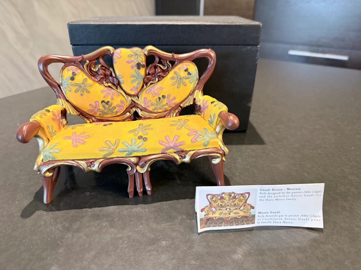 This is a rare miniature sofa piece designed by Gaudí, inspired by the painter Alice Clapés. It's a decorative piece for collectors or fans of Gaudí's work. The sofa measures approximately 6 inches wide and 4 inches tall.