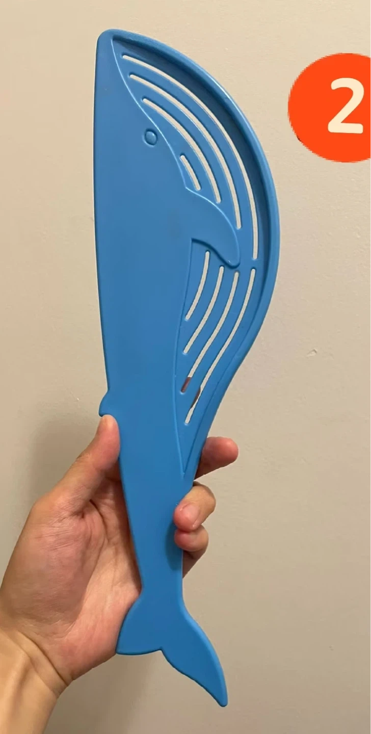 A fun blue whale-shaped kitchen tool, perfect for straining small portions of food like pasta or berries. It's made of durable plastic and is easy to clean. Kids love using this for their snacks!