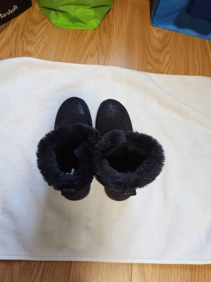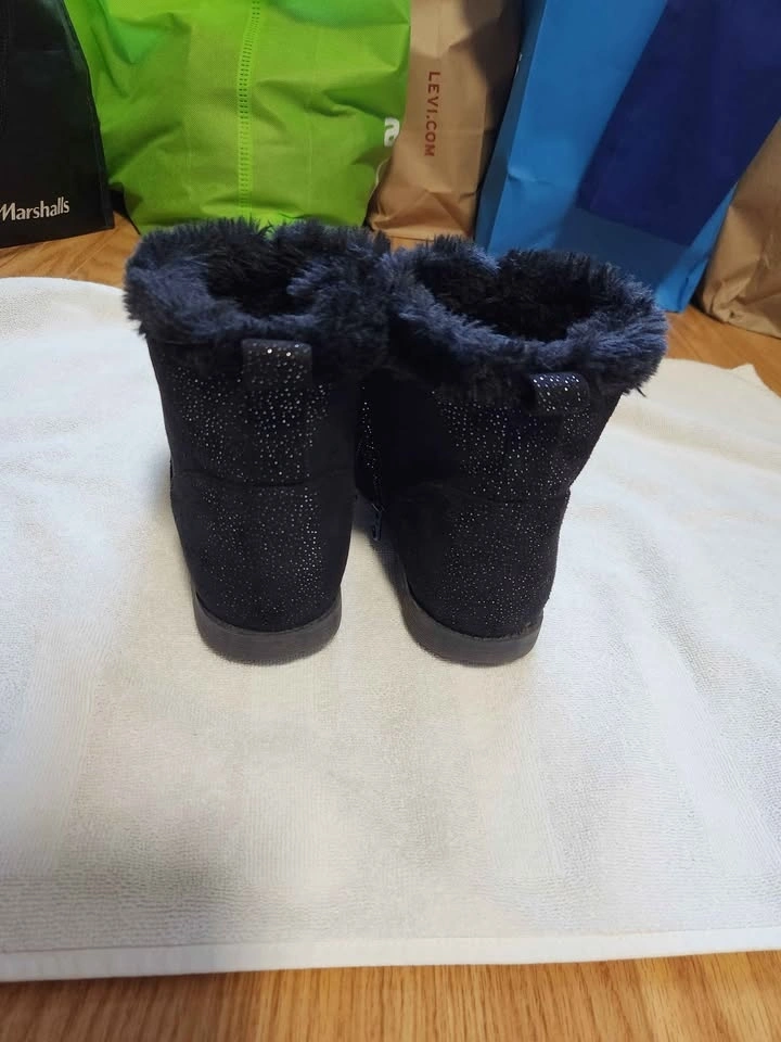 Women’s black faux suede ankle boots with a soft faux fur lining, plus matching black knit leg warmers/boot cuffs. Perfect winter combo! You can wear the leg warmers over the boots or separately with other shoes for extra warmth and style.