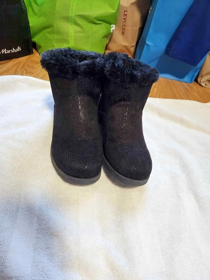 Women’s black faux suede ankle boots with a soft faux fur lining, plus matching black knit leg warmers/boot cuffs. Perfect winter combo! You can wear the leg warmers over the boots or separately with other shoes for extra warmth and style.