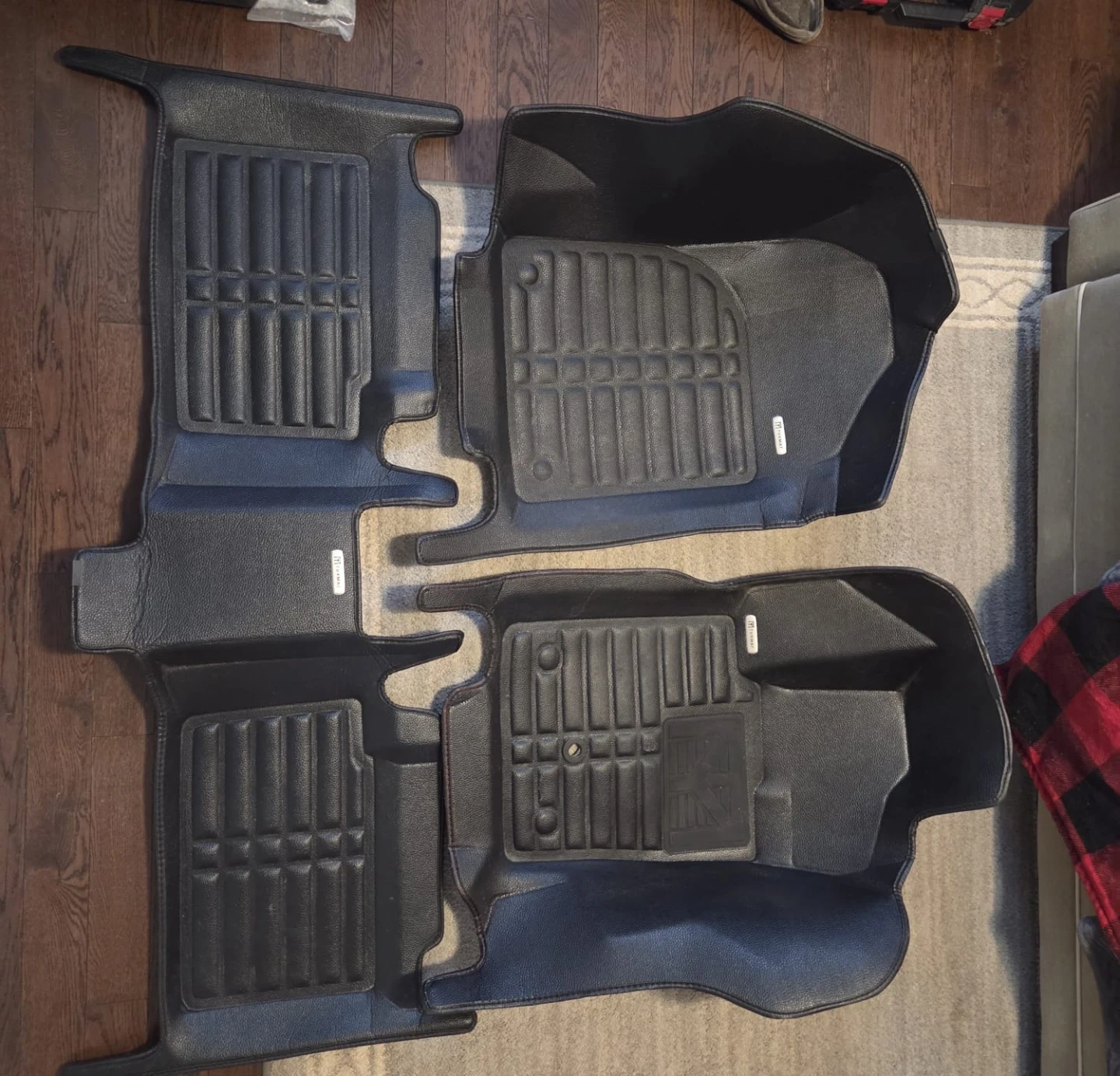 Black TUXMAT car floor mats in great condition. These durable mats help protect your vehicle's interior from dirt and spills. They're made of a waterproof material and feature a textured surface for better grip.