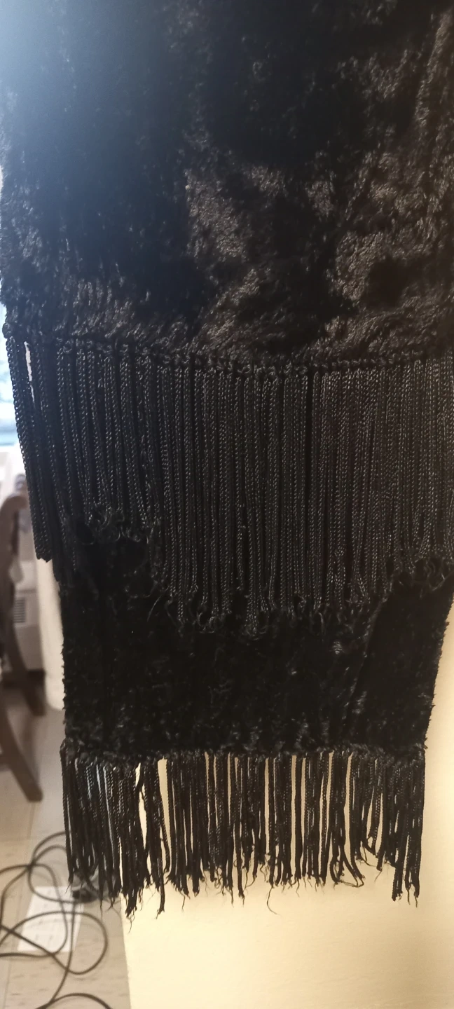 A black velvet scarf with fringe detailing on both ends. It's soft and has a crushed velvet texture. This scarf adds a touch of elegance to any outfit!