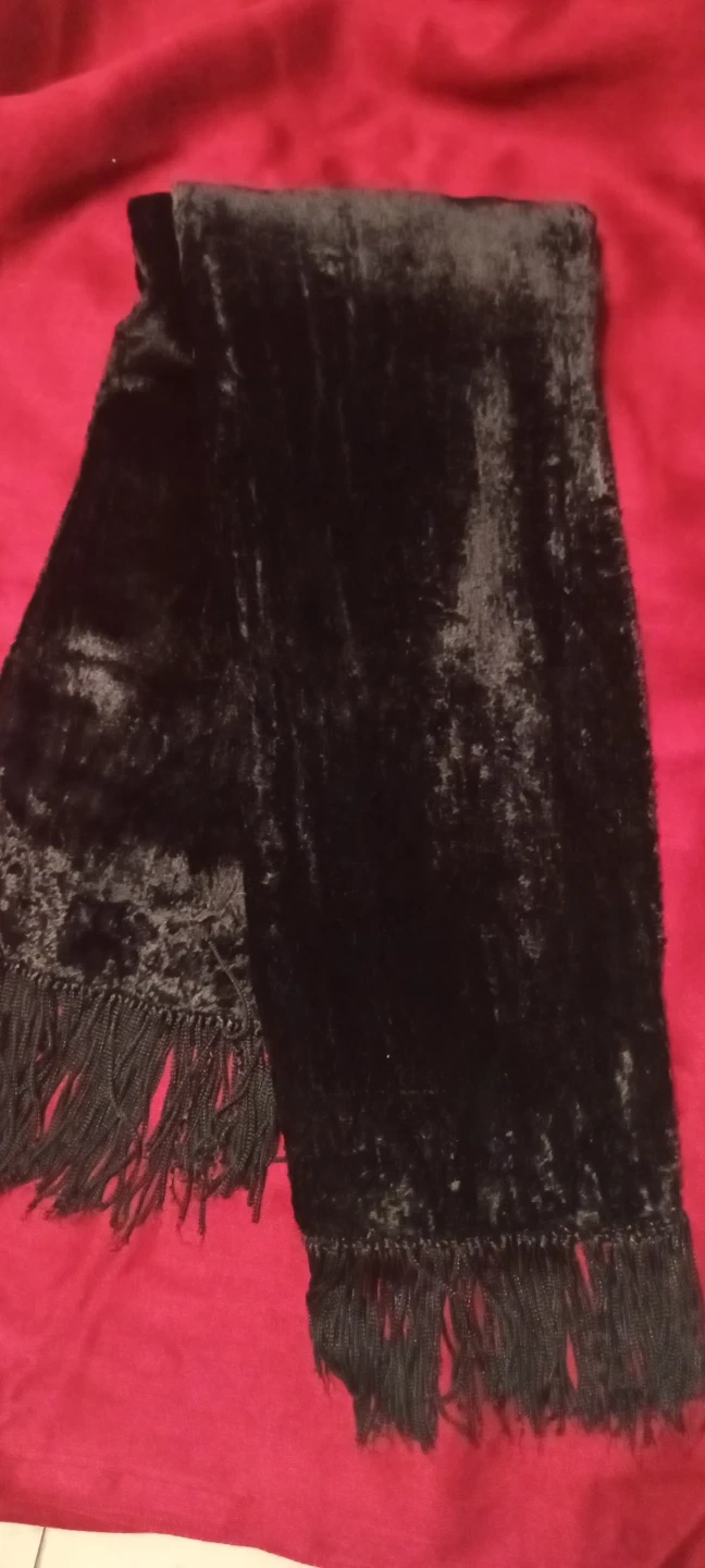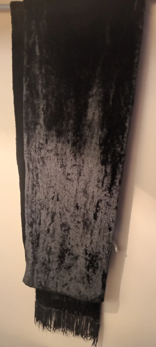 A black velvet scarf with fringe detailing on both ends. It's soft and has a crushed velvet texture. This scarf adds a touch of elegance to any outfit!