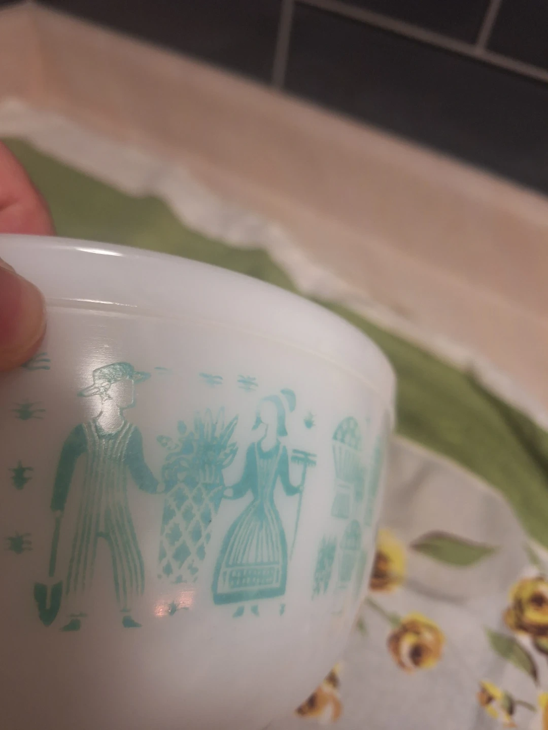This bowl is in ok condition for a 65 year old kitchen item. Has significant fading of turquoise pattern but retains surface shine, as per photos.