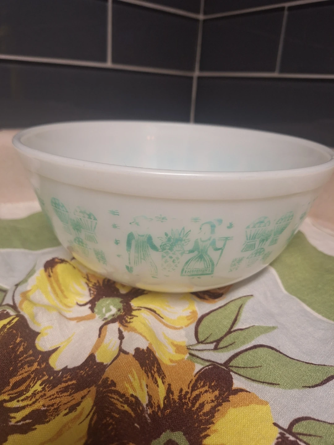 This bowl is in ok condition for a 65 year old kitchen item. Has significant fading of turquoise pattern but retains surface shine, as per photos.