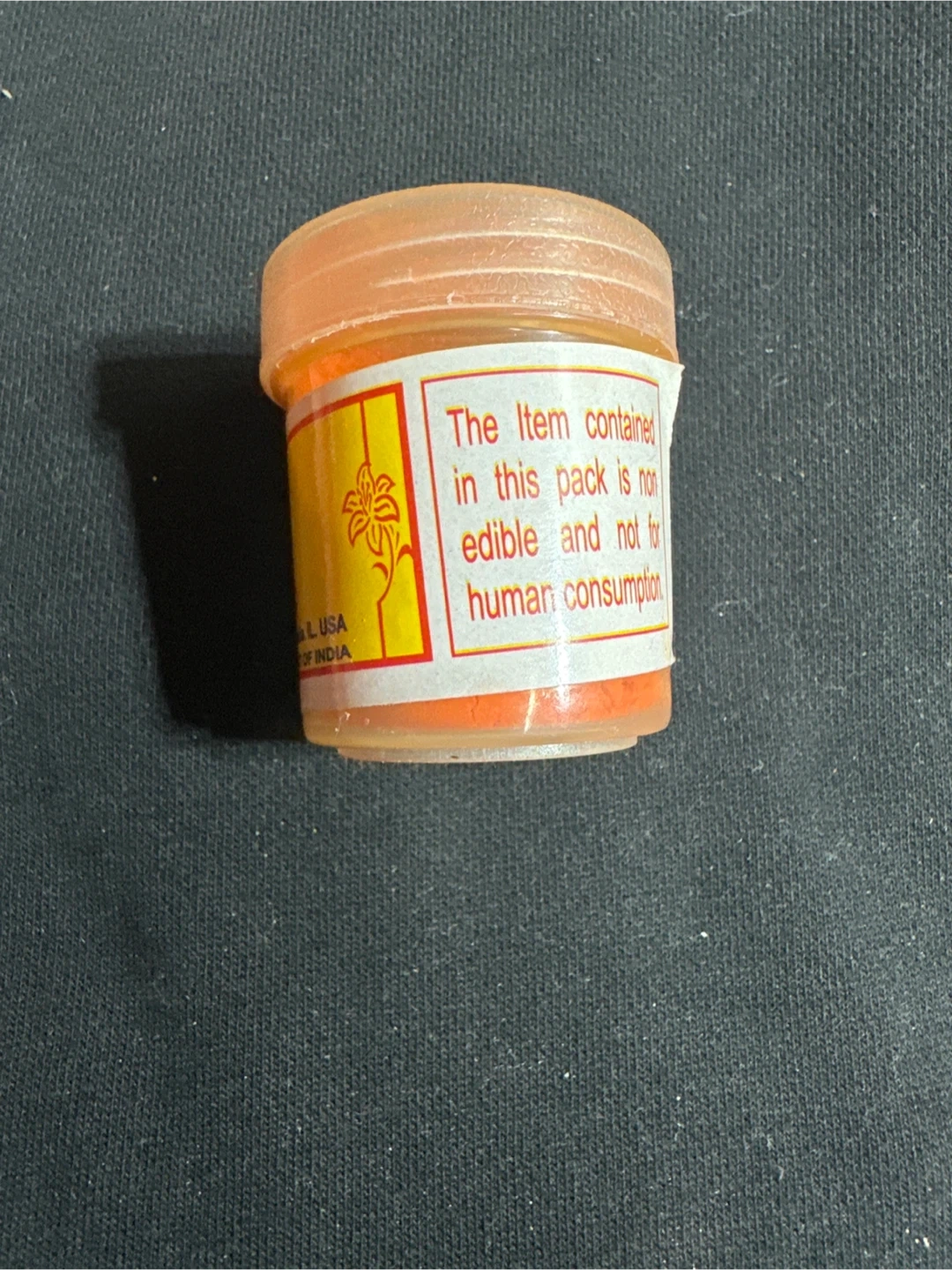 Sindoor Small jar with an orange lid and contents. The label states 'The item contained in this pack is non-edible and not for human consumption.' Made in India.
