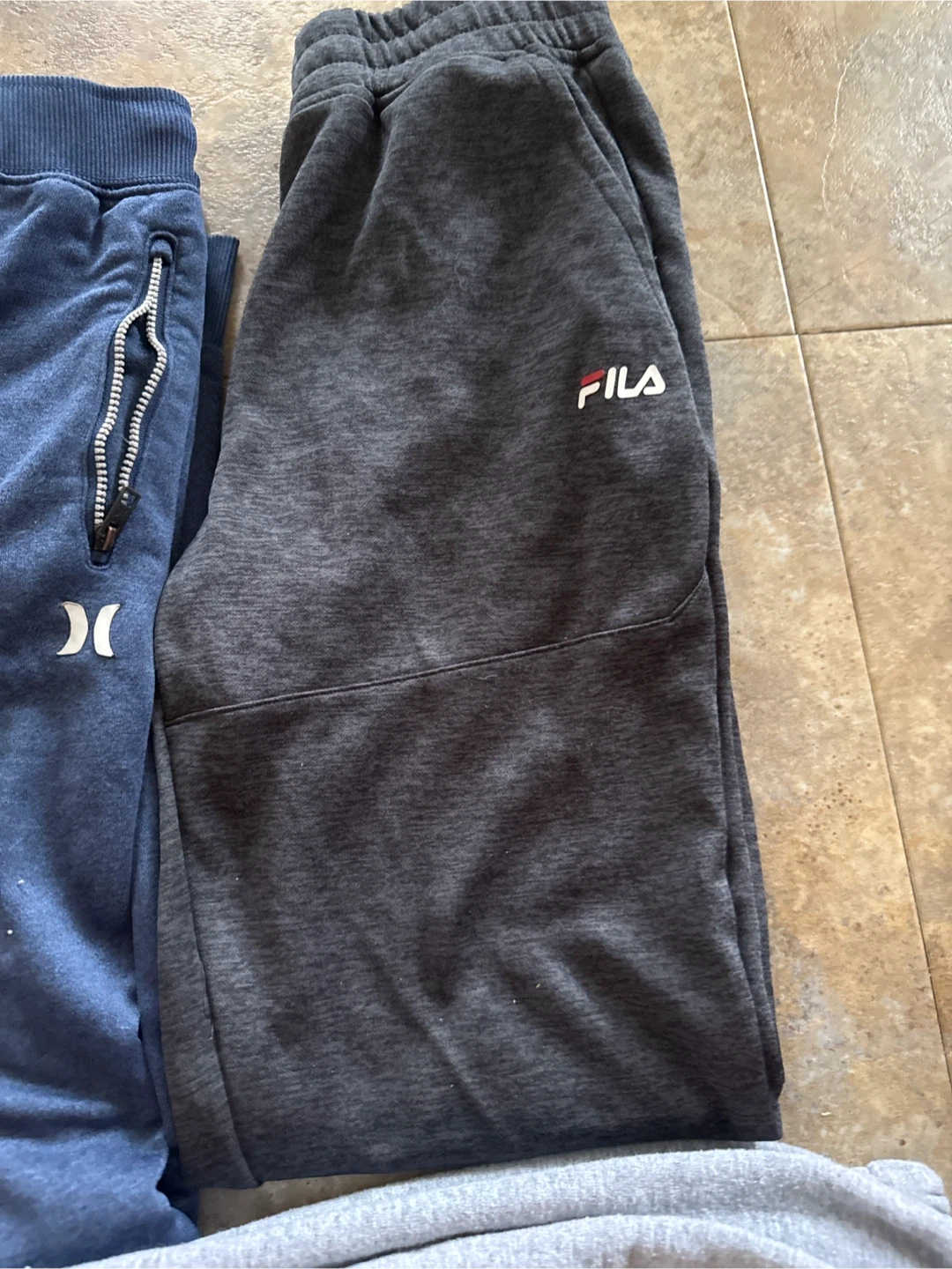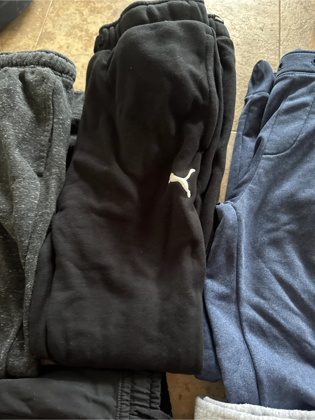 Bundle of five pairs of men's sweatpants. Includes Fila, Hurley, and Puma brands. Colours are black, grey, and blue. Made for comfort and casual wear!