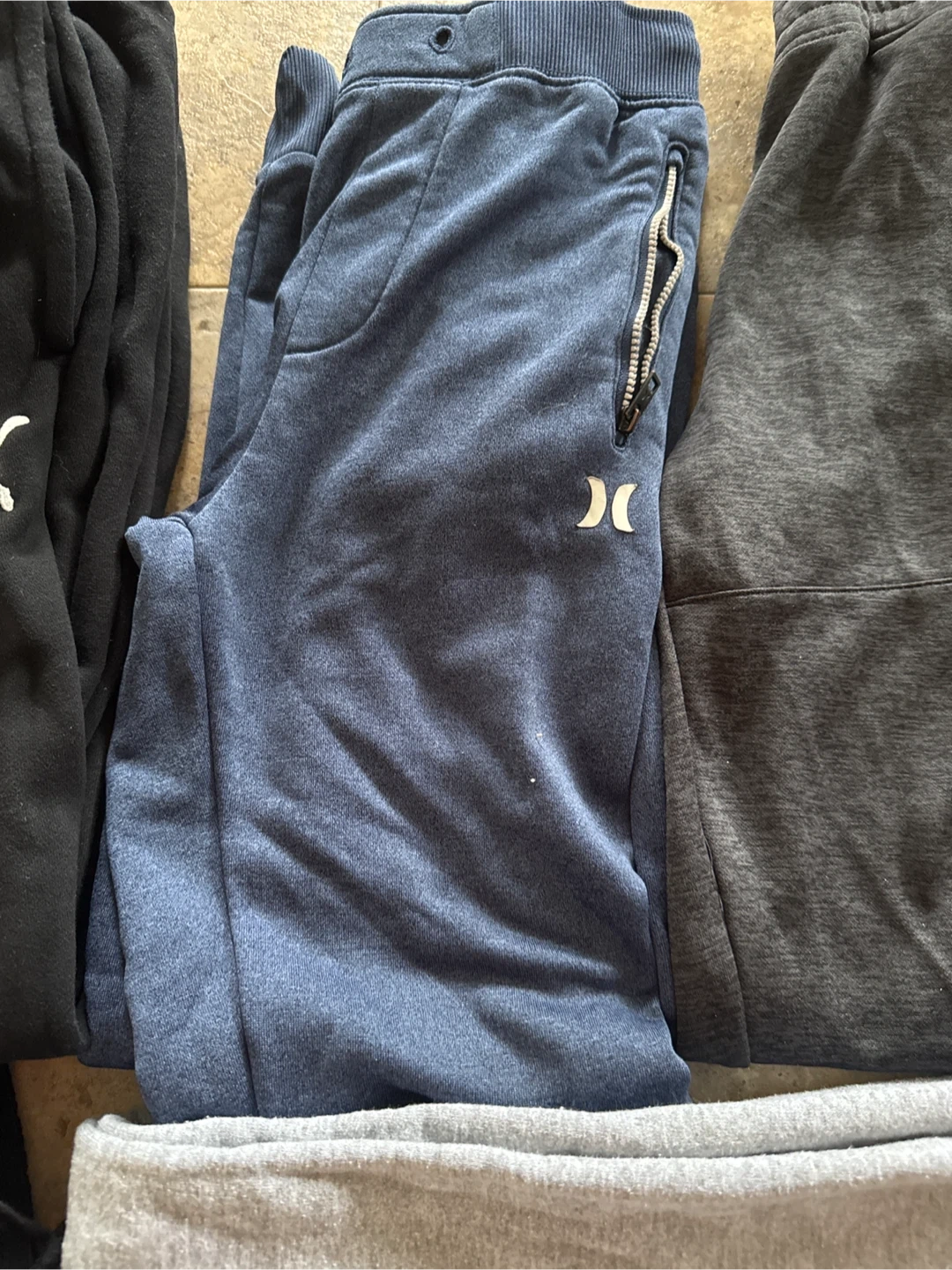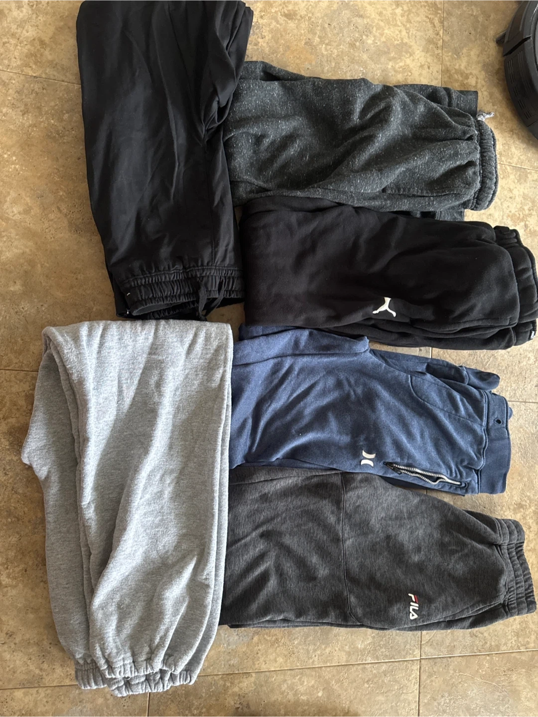 Bundle of five pairs of men's sweatpants. Includes Fila, Hurley, and Puma brands. Colours are black, grey, and blue. Made for comfort and casual wear!