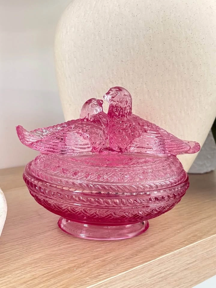 Vintage Pressed Glass Bird Trinket Boxes – Pink Lovebirds / Hen