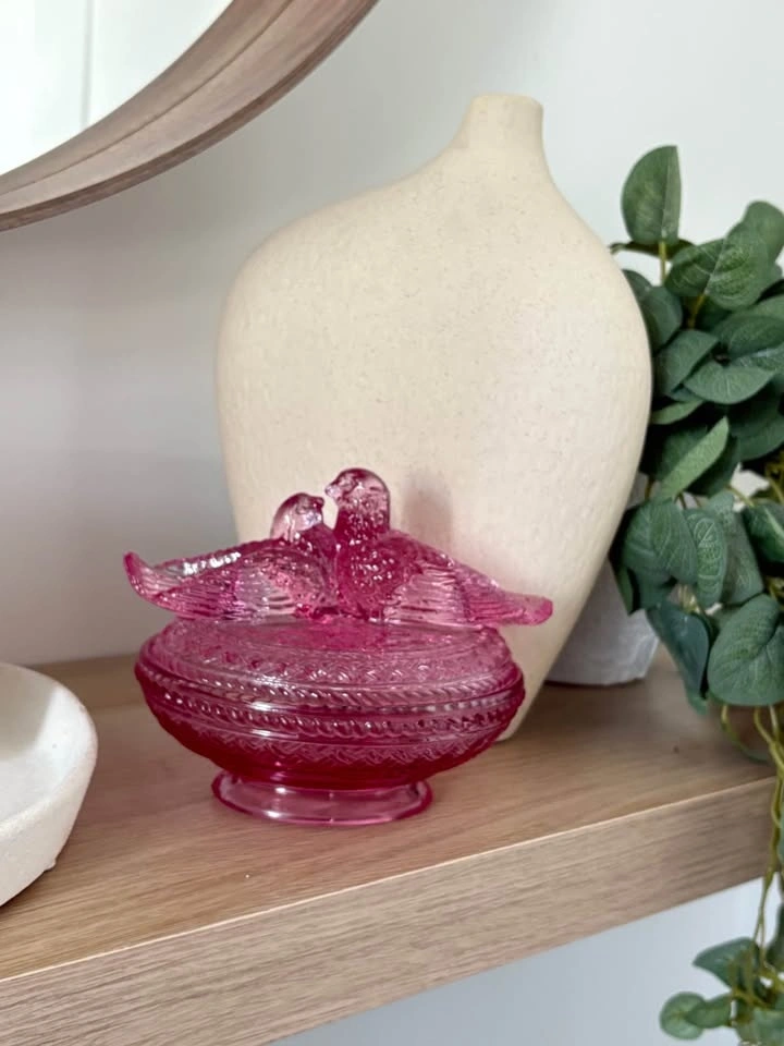 Absolutely charming vintage pressed glass trinket boxes featuring bird finials. Perfect for jewelry, rings, keepsakes, or as pretty vanity or shelf décor. Pink pressed glass box with lovebird/dove lid. Beautiful texture and color – catches the light so nicely. Vintage condition with minor signs of age (no cracks or major chips). These are classic mid-century style pieces and look stunning styled together or on their own.