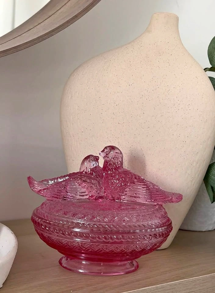 Vintage Pressed Glass Bird Trinket Boxes – Pink Lovebirds / Hen