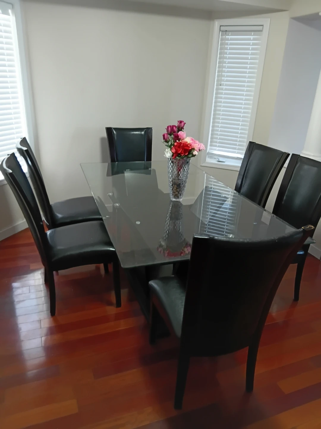 Rectangular glass-top dining table with a modern black base. Comes with six matching black faux-leather chairs. Seats up to six people comfortably.