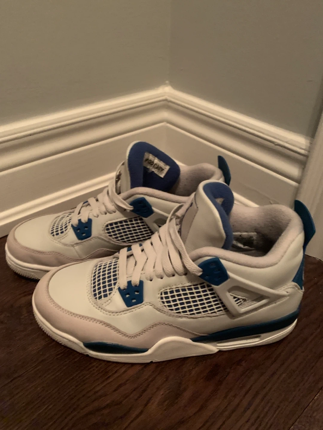 White and blue Air Jordan 4 "Military Blue" sneakers. Leather and mesh construction. Lace-up closure. These are a classic streetwear staple. Size 6/5 us