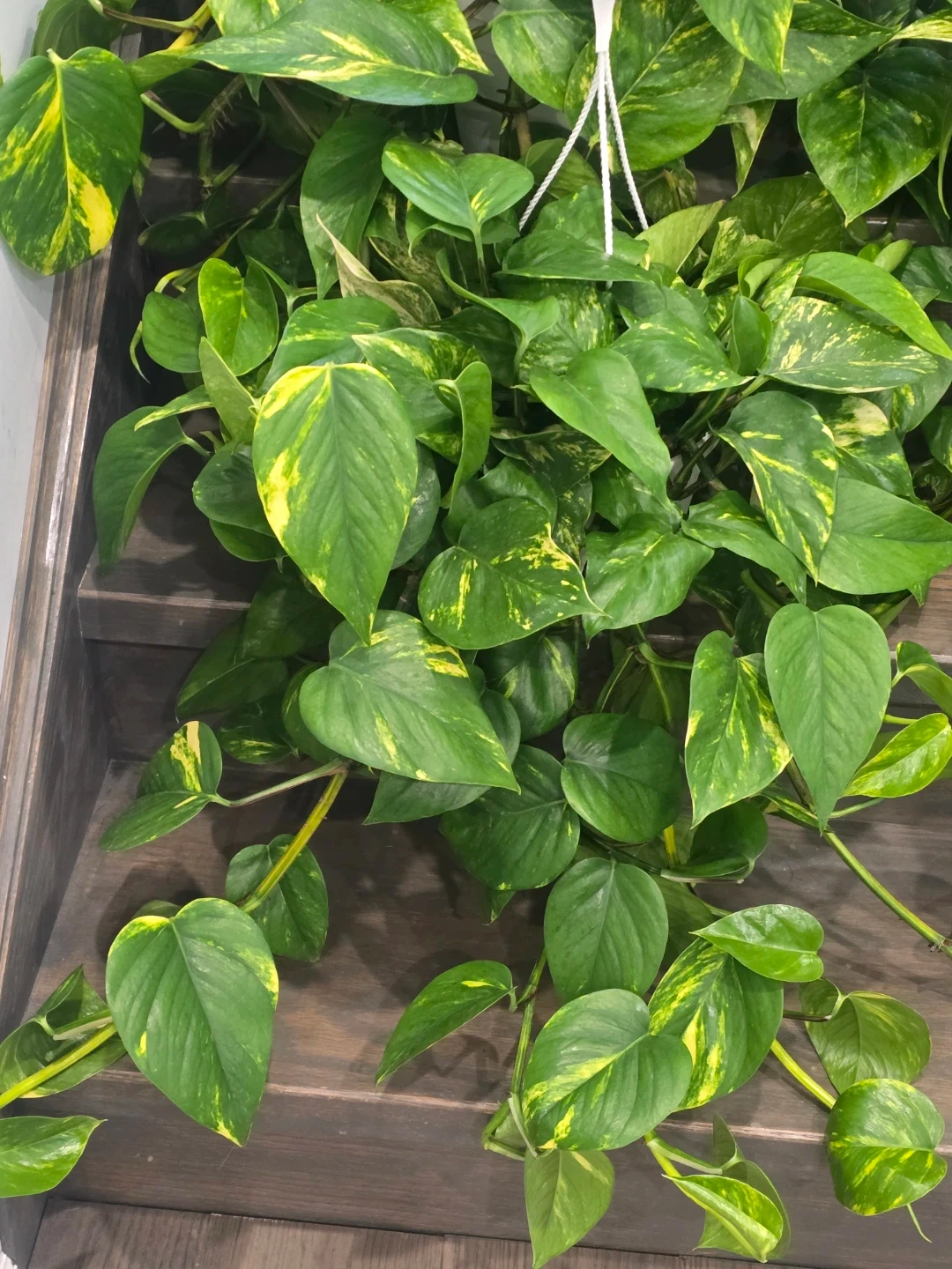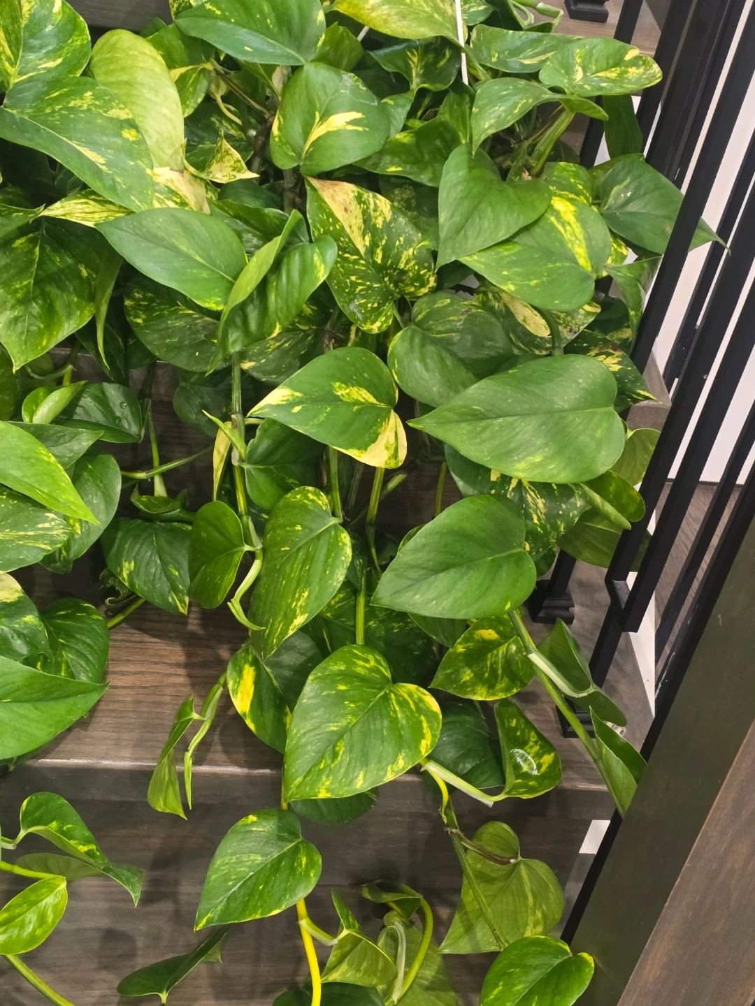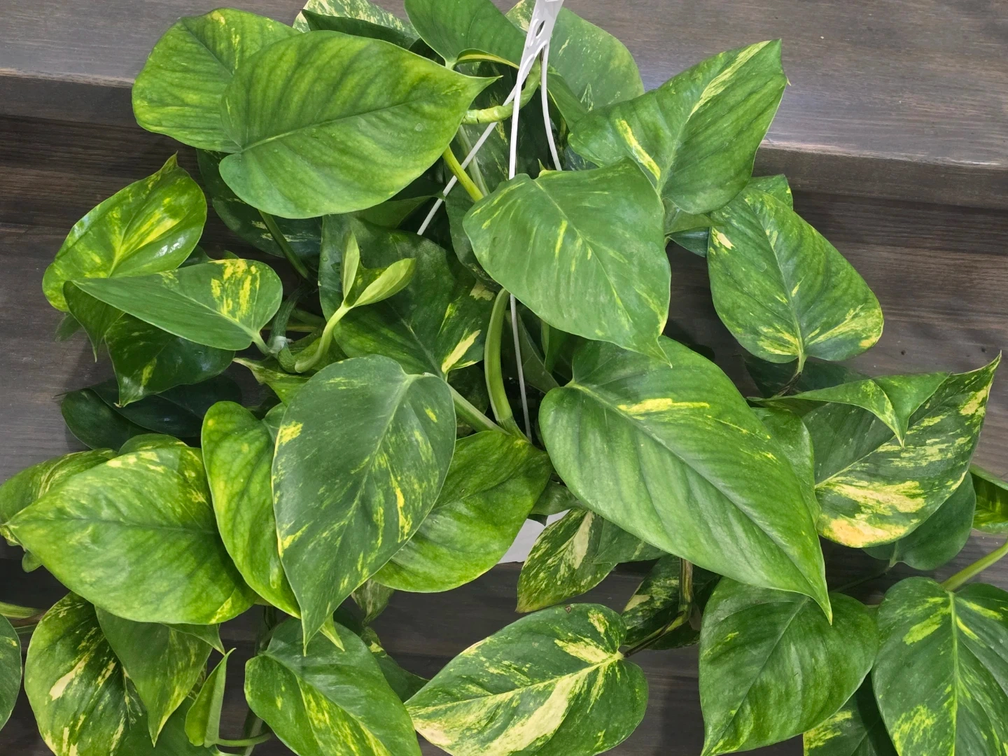 Lush and vibrant golden pothos plant with variegated green and yellow leaves. It's a healthy, trailing plant perfect for adding a touch of nature indoors. This plant is easy to care for and will brighten up any space!